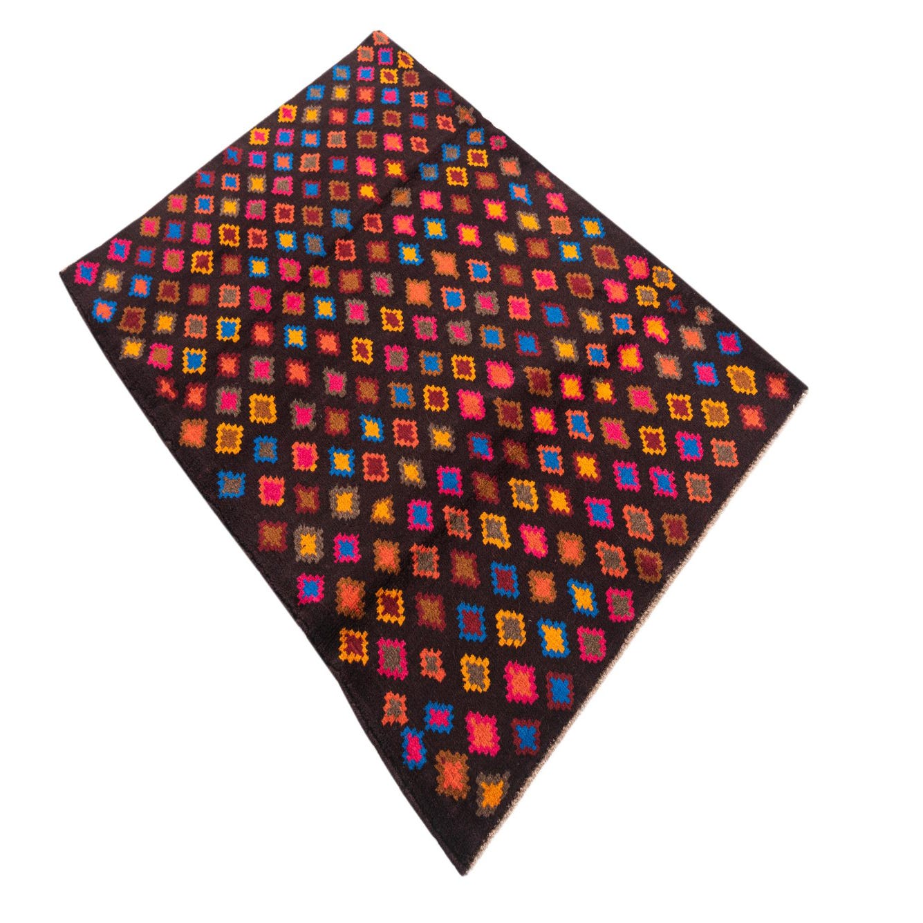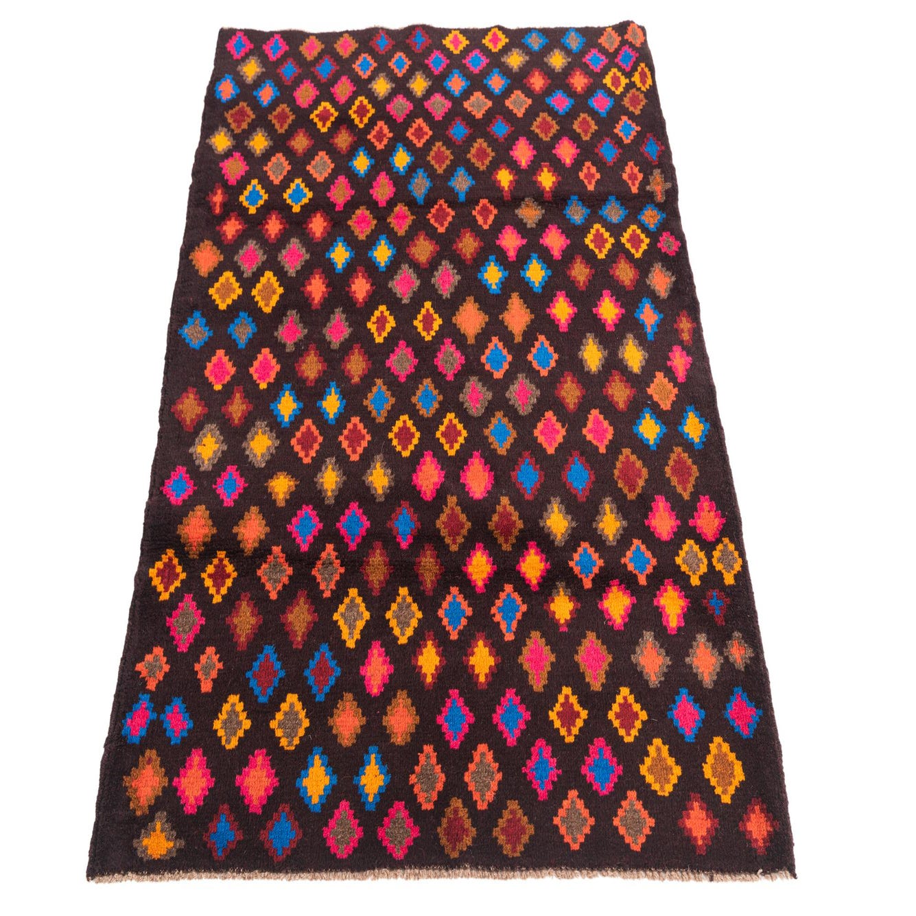 A 3x4 rectangular Balouch rug with a dark brown background patterned with colorful diamond shapes in red, orange, blue, and pink.