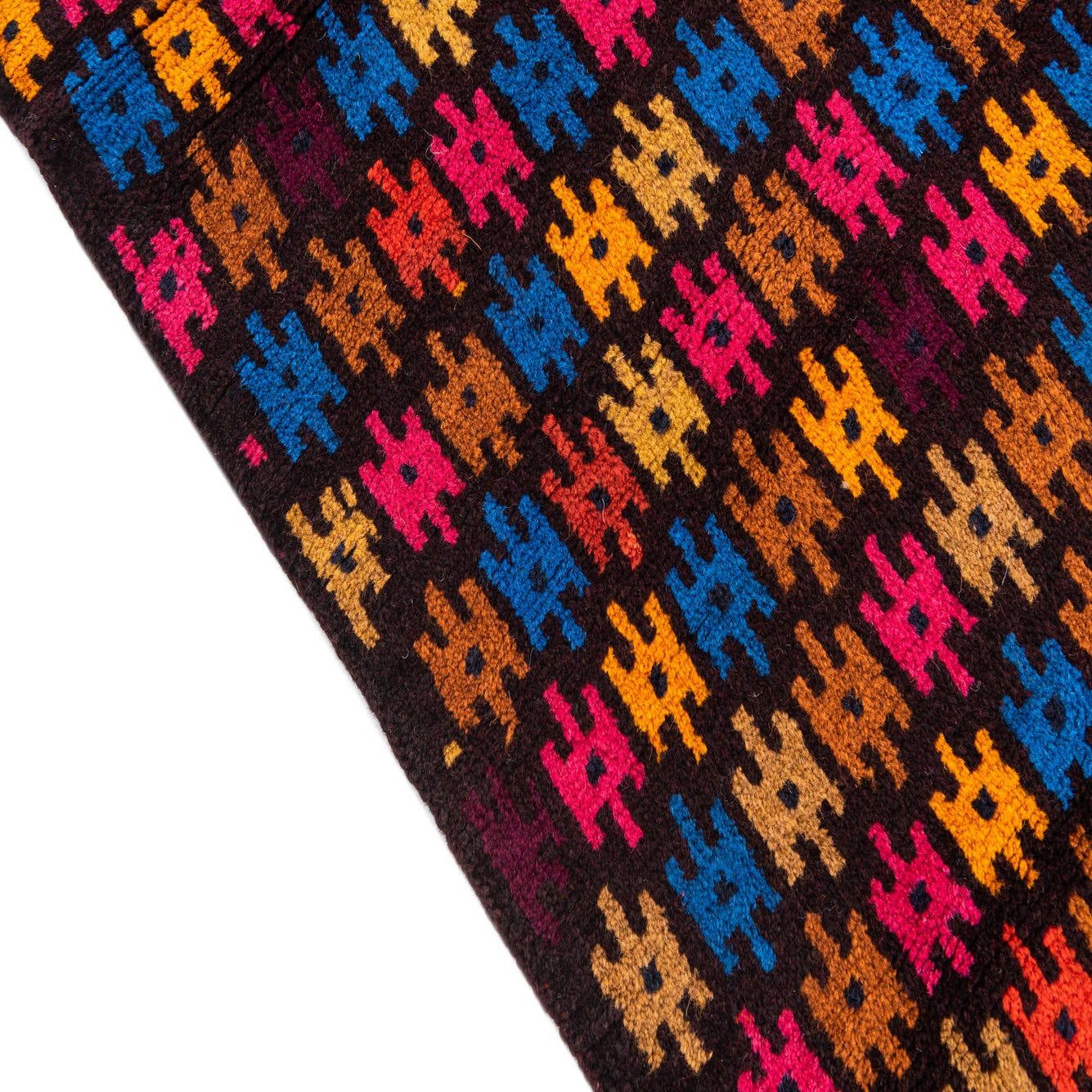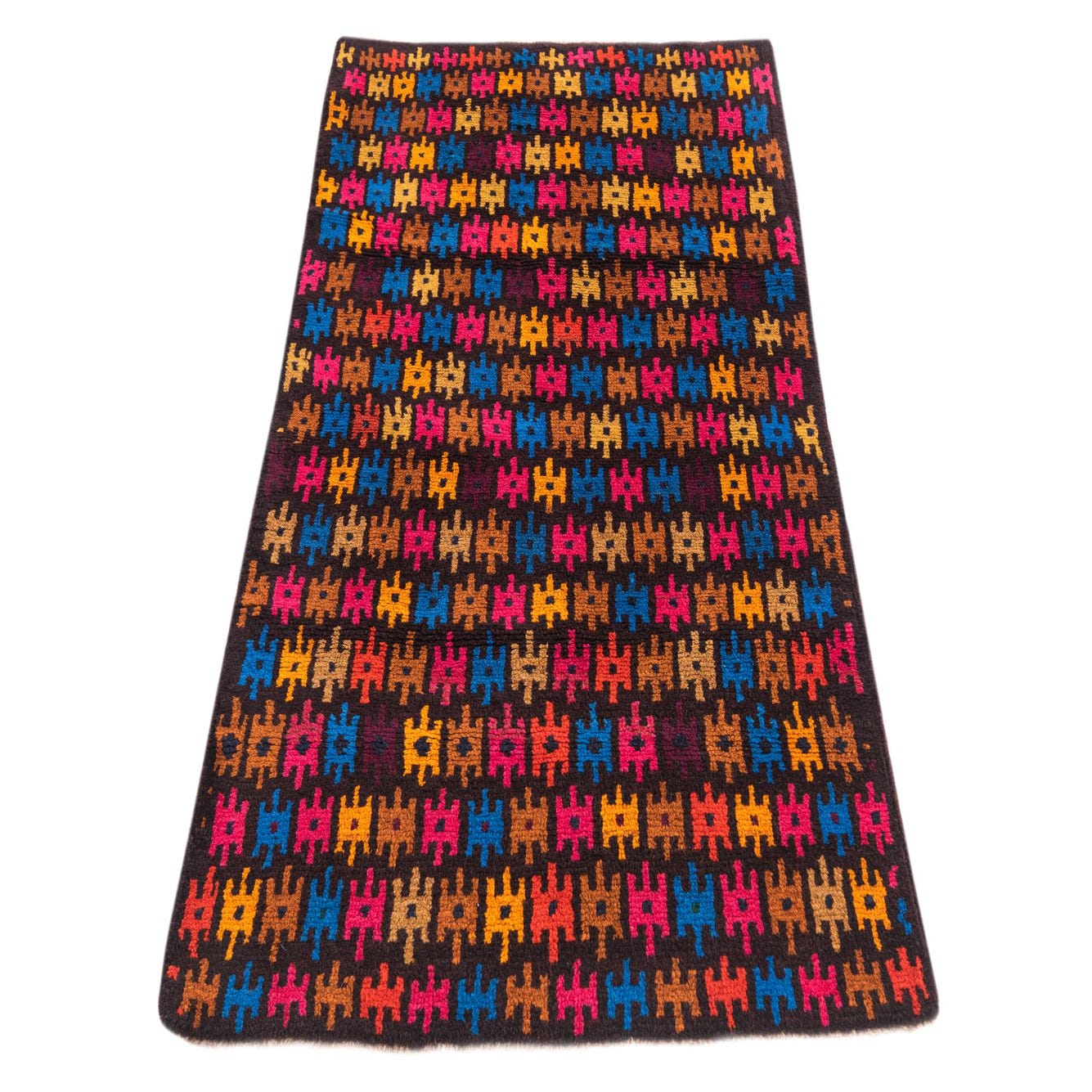 A 3x5 rectangular Balouch rug with a dark brown background and a vibrant tribal pattern in red, orange, blue, and pink.