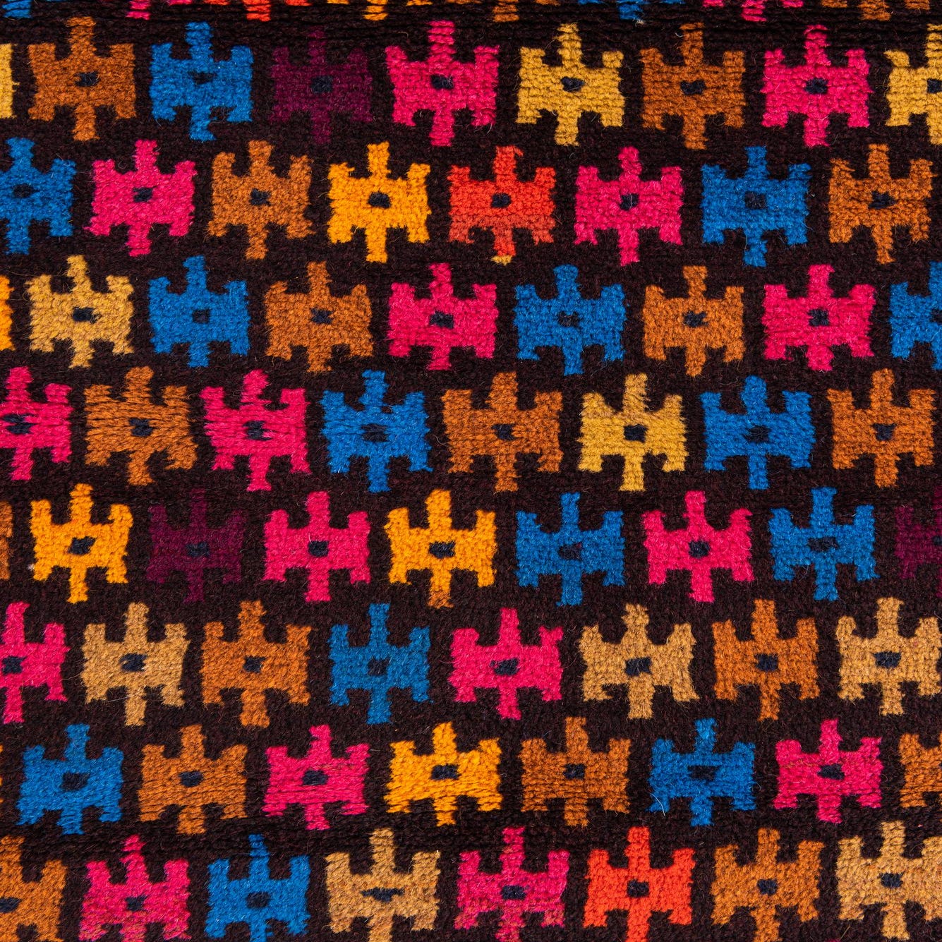 Primary color is Maroon. Colors in this rug include: Maroon, Brown, Orange, Yellow, Pink, Blue.
