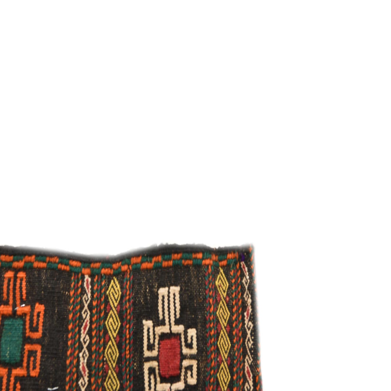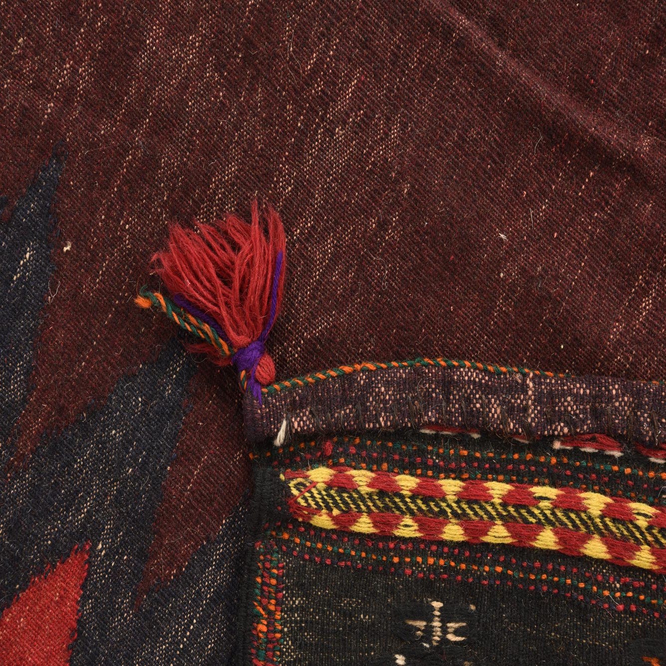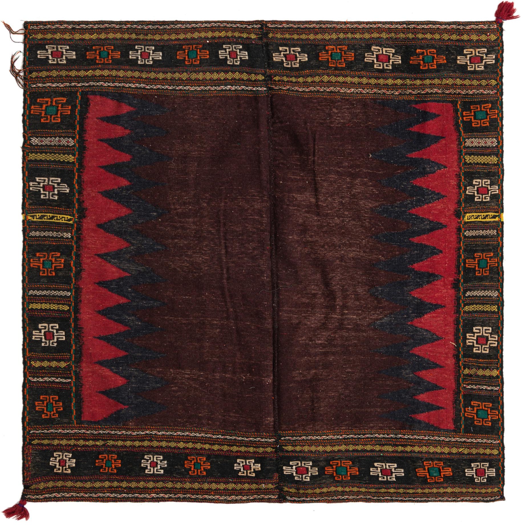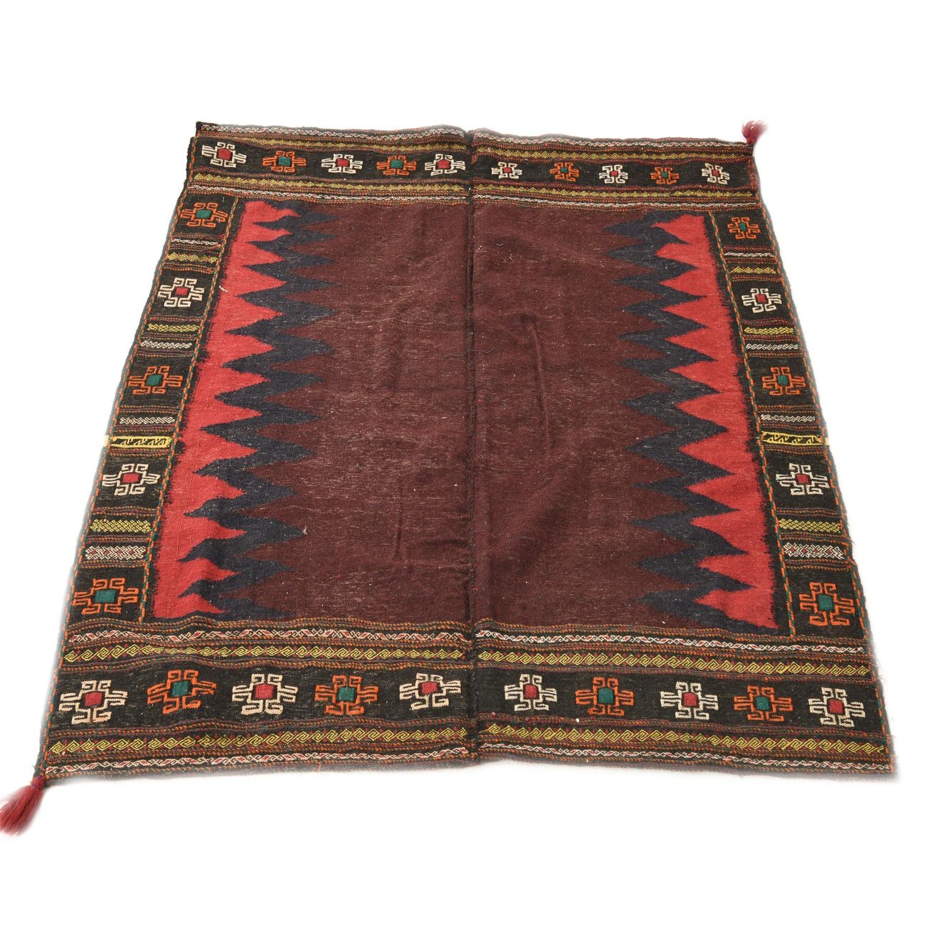 Deep maroon forms the rich ground of this handwoven wool piece, interrupted along the sides by a serrated sawtooth motif in deep black and red that adds crisp, geometric movement. Narrow black borders carry a repeating medallion motif in orange, yellow, green and ivory, accented by fine chevron bands; the palette reads warm and layered without overpowering a room. Hand Woven of 100% Wool, the construction is a low-profile, tightly woven flatweave with a firm but pleasant hand and subtle color variation that gives the surface a lived-in, handcrafted character.
