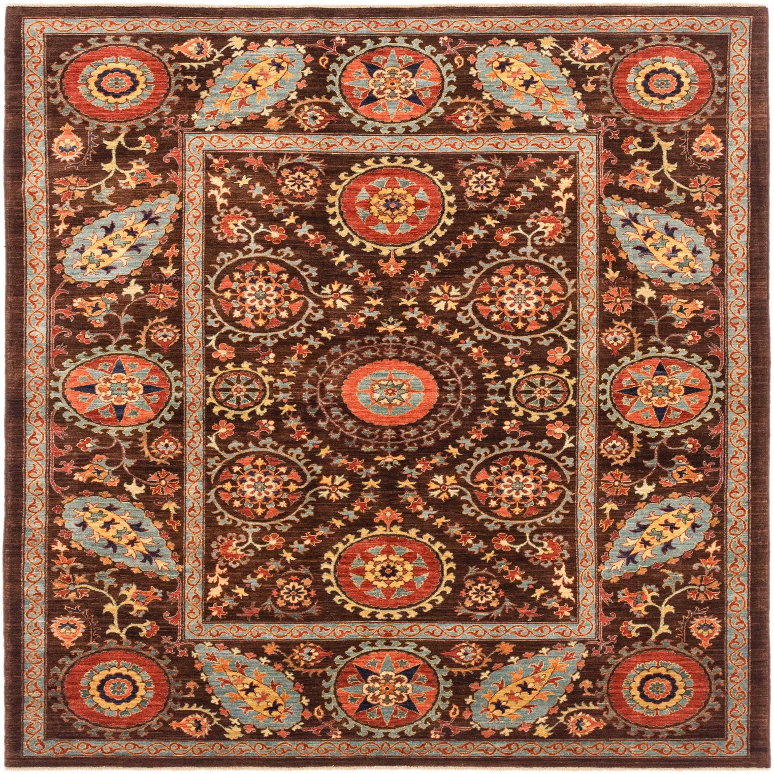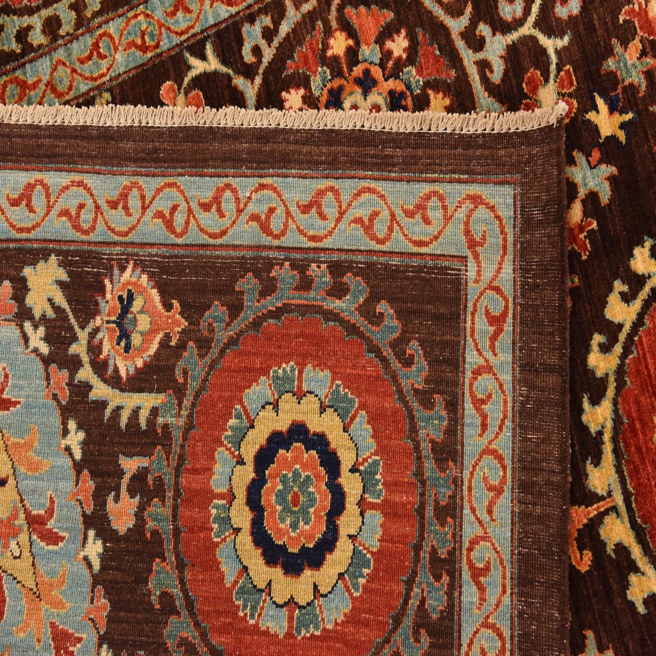 The Ariana Ziegler collection presents a 6x9 hand-knotted rug crafted from 100% hand-spun wool, offering a balance of durability and a plush feel underfoot. The rug features a maroon background that sets a deep, rich tone for the space it occupies. Intricate patterns in hues of blue, cream, gold, green, navy blue, and red adorn this piece, with a medley of ornamental motifs and geometric elements that speak to a traditional aesthetic.