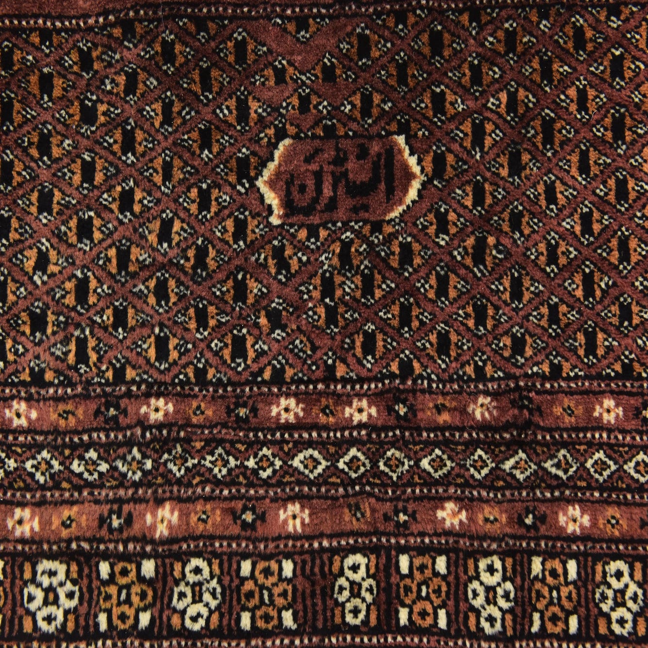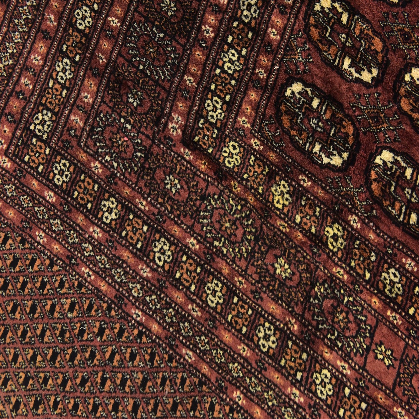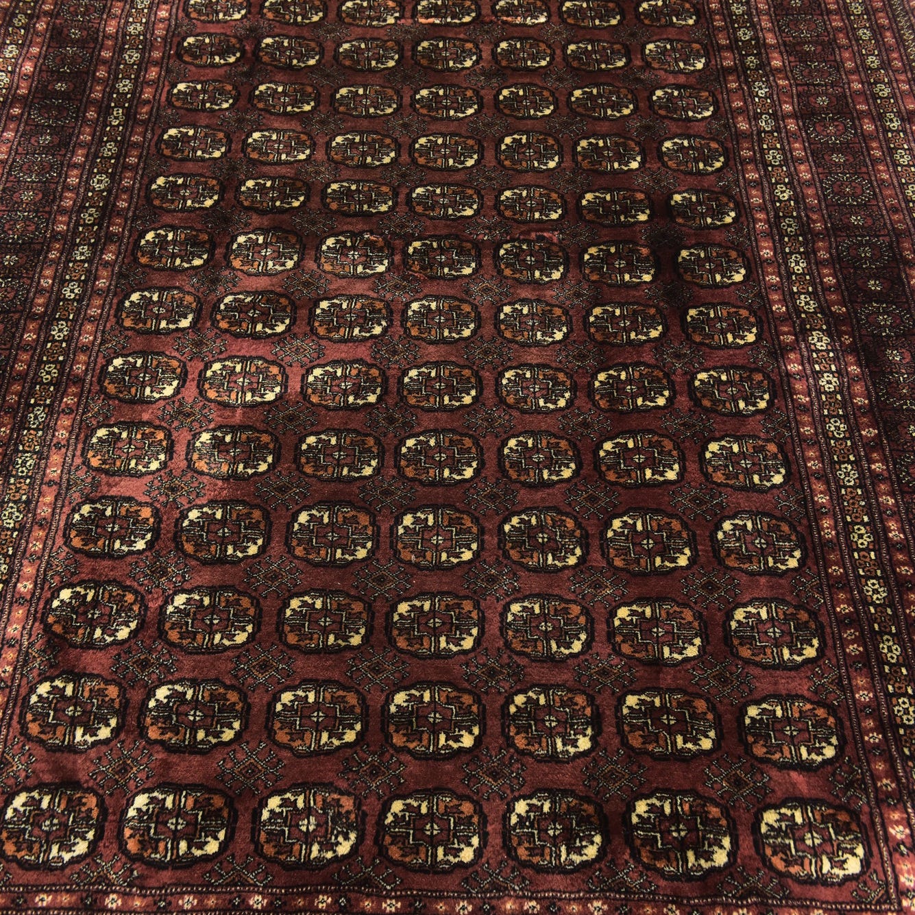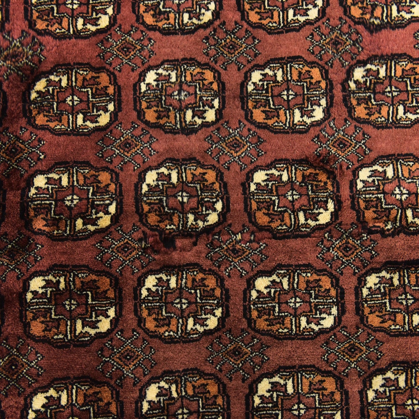 Primary color is Maroon. Colors in this rug include: Maroon, Black, Ivory, Peach, Burgundy.