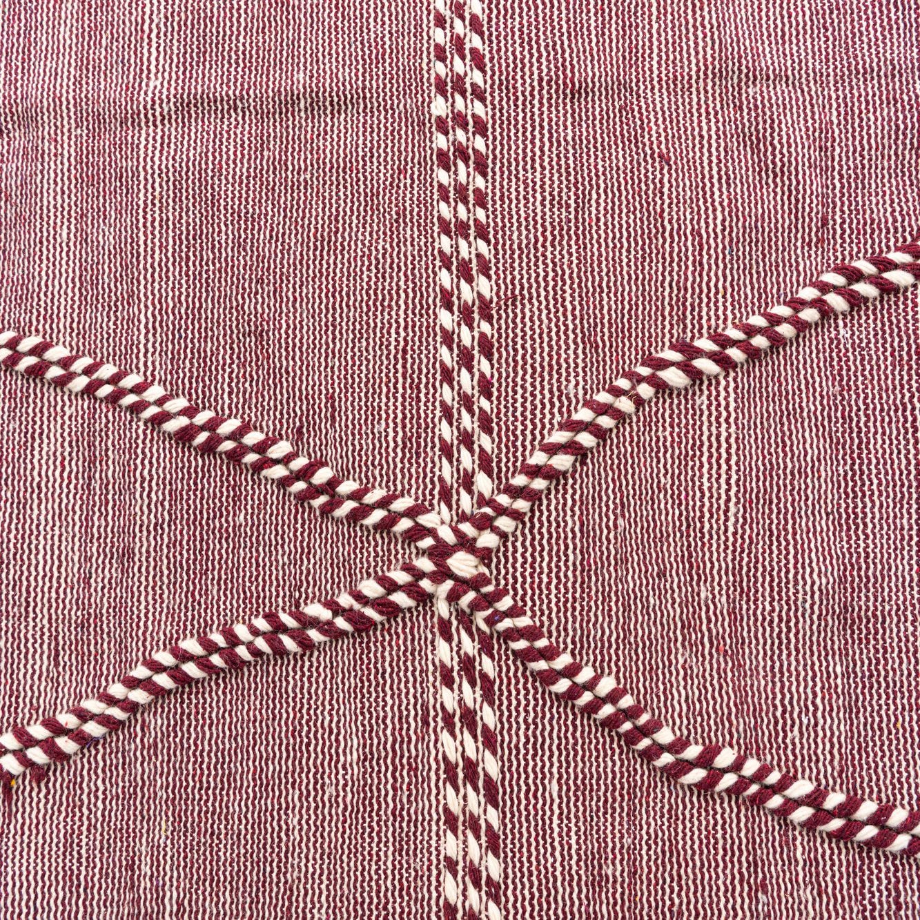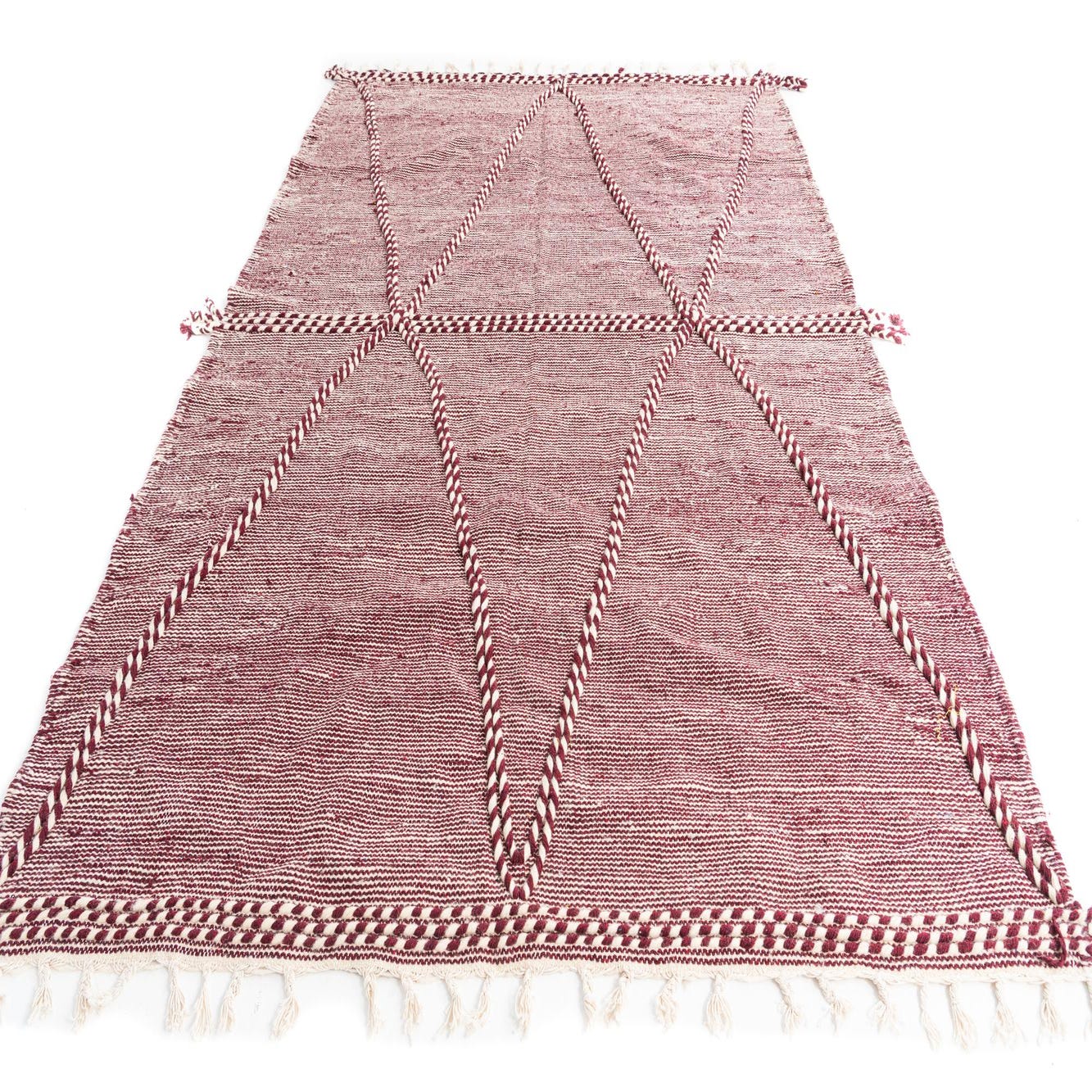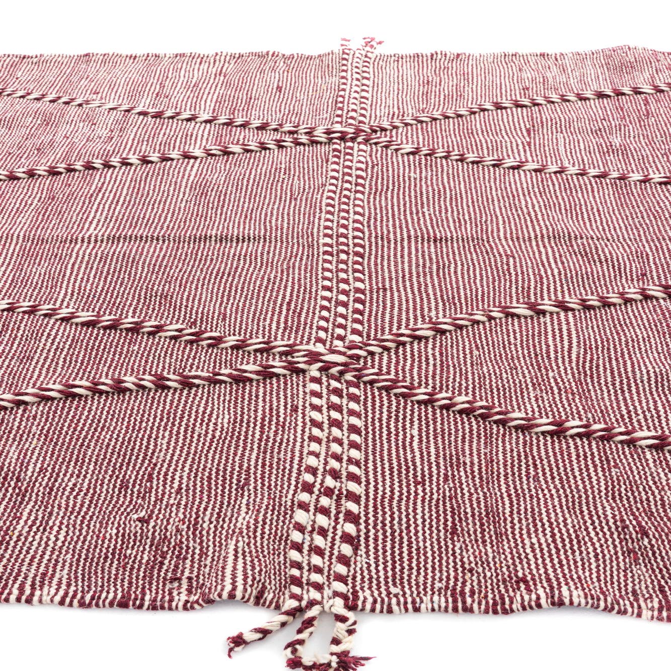 Ideal for anchoring furniture in a living room or defining a dining area, this Moroccan rug can elevate a space with its bold simplicity. Its robust construction and larger dimensions make it suitable for high-traffic areas, while the maroon and ivory colorway would complement wood tones, neutral palettes, and more vibrant decor elements with ease.
