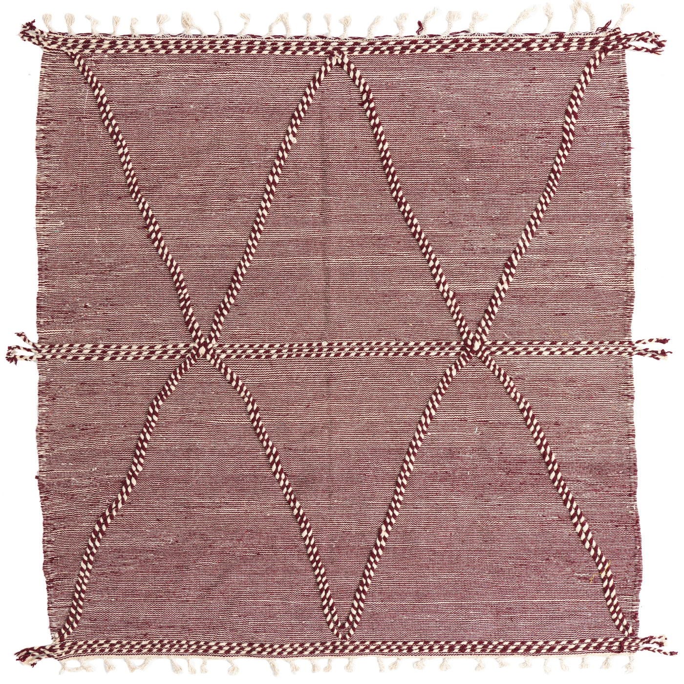 This hand-knotted Moroccan collection rug offers an aesthetic that combines traditional craftsmanship with a minimalist design. The maroon background provides a warm, deep base, contrasted harmoniously with ivory accents that create a simple yet engaging geometric pattern across the 7x10 surface. Crafted from 100% wool, the rug presents a plush texture that is both inviting and durable.
