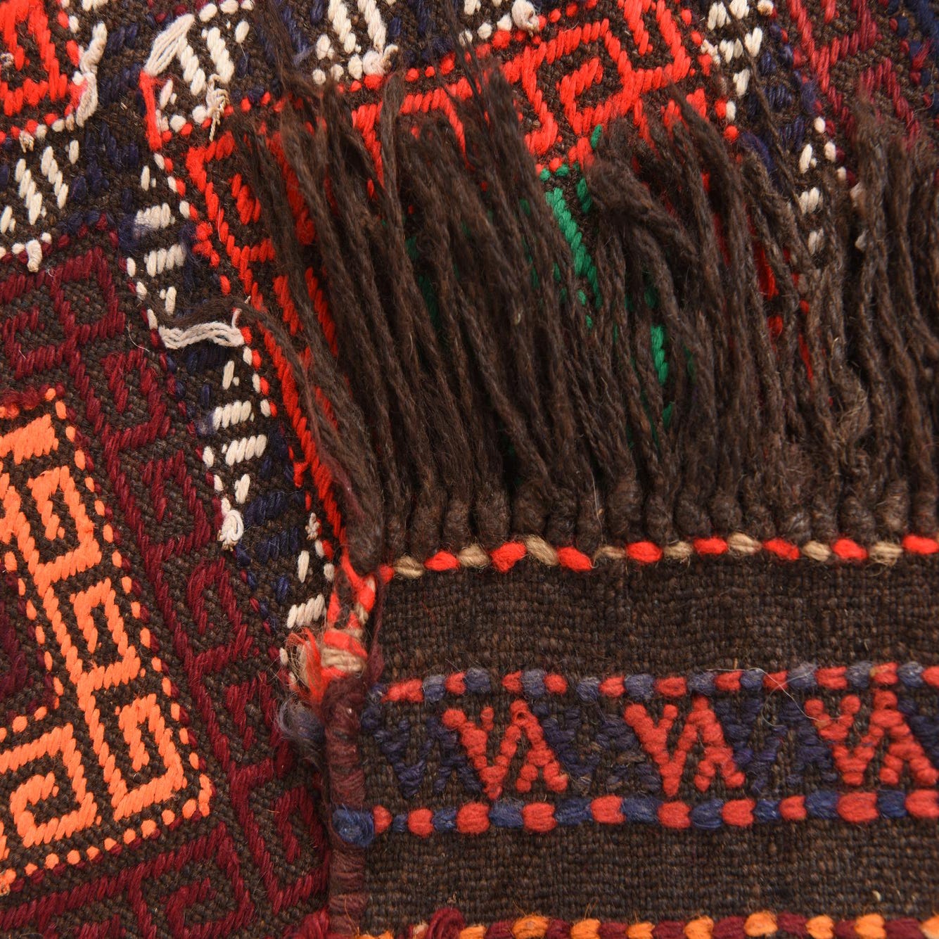 The texture of the rug is characteristic of handwoven kilims, with a flatweave construction that gives it a lighter feel, making it versatile for various settings. It maintains the authenticity of traditional craftsmanship, evident in the meticulously woven patterns.