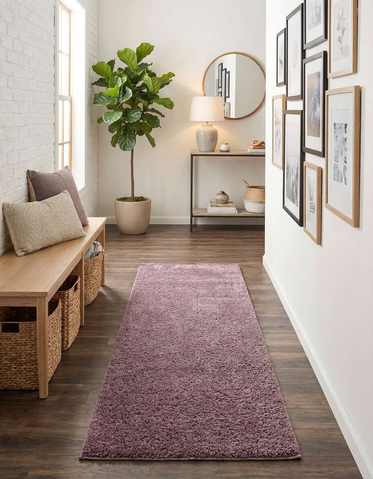 A soft, solid field of mauve anchors this runner, with subtle violet undertones that appear as the pile catches the light. The high, shag-style pile creates a plush surface you can feel underfoot; dense polyester fibers give the rug a velvety hand and a gentle sheen that adds visual depth without any pattern distraction. This is a machine-made piece constructed from 100% polyester, designed to deliver consistent texture across its length.