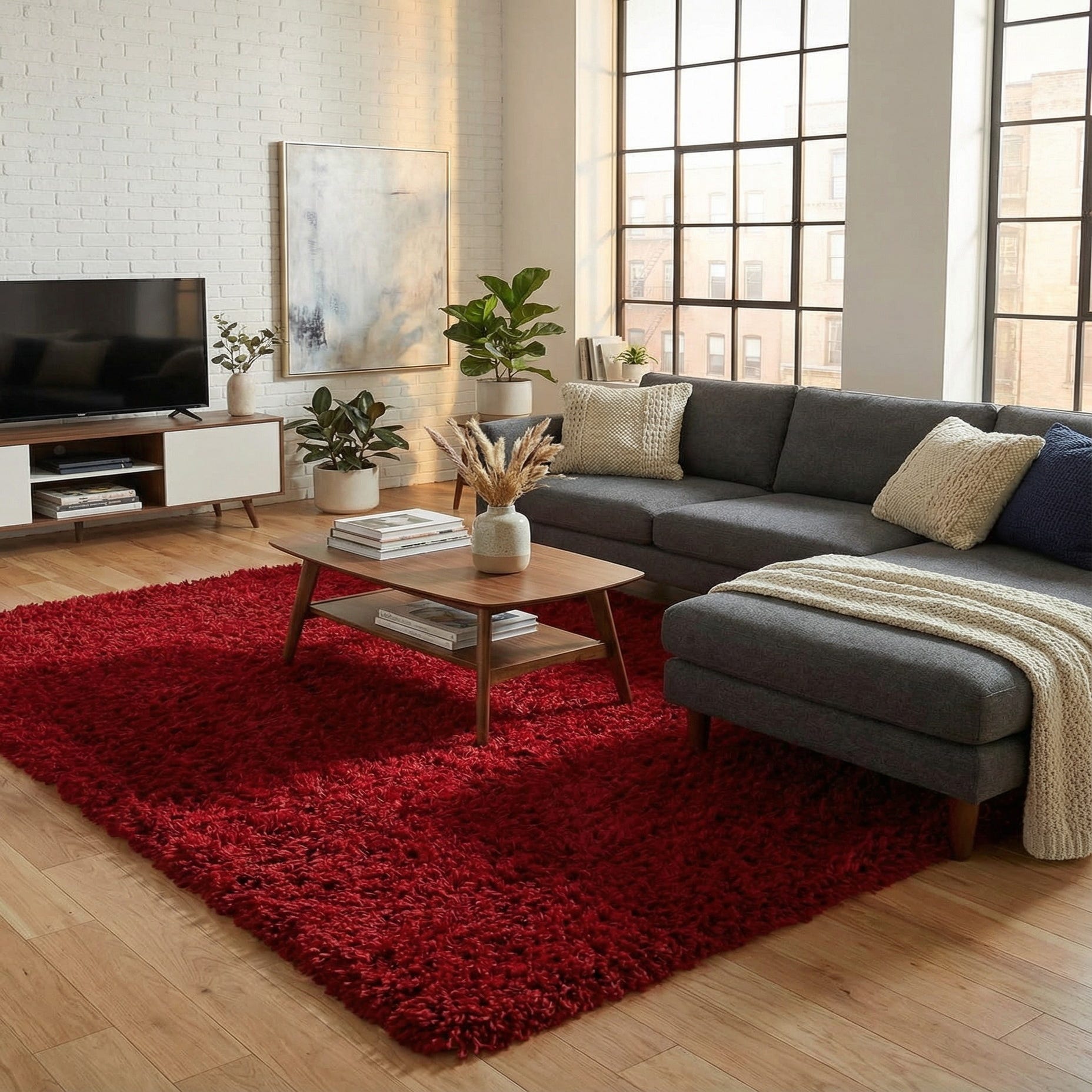 A rich merlot shag with a plush, high-pile surface that invites bare feet. The rug’s solid field is built from dense polyester fibers, and subtle variations in pile direction create a soft, lived-in texture and depth without a printed pattern. Machine-made from 100% polyester, the pile feels cushiony and velvety to the touch while the shag profile offers a tactile presence that warms a room visually and underfoot.
