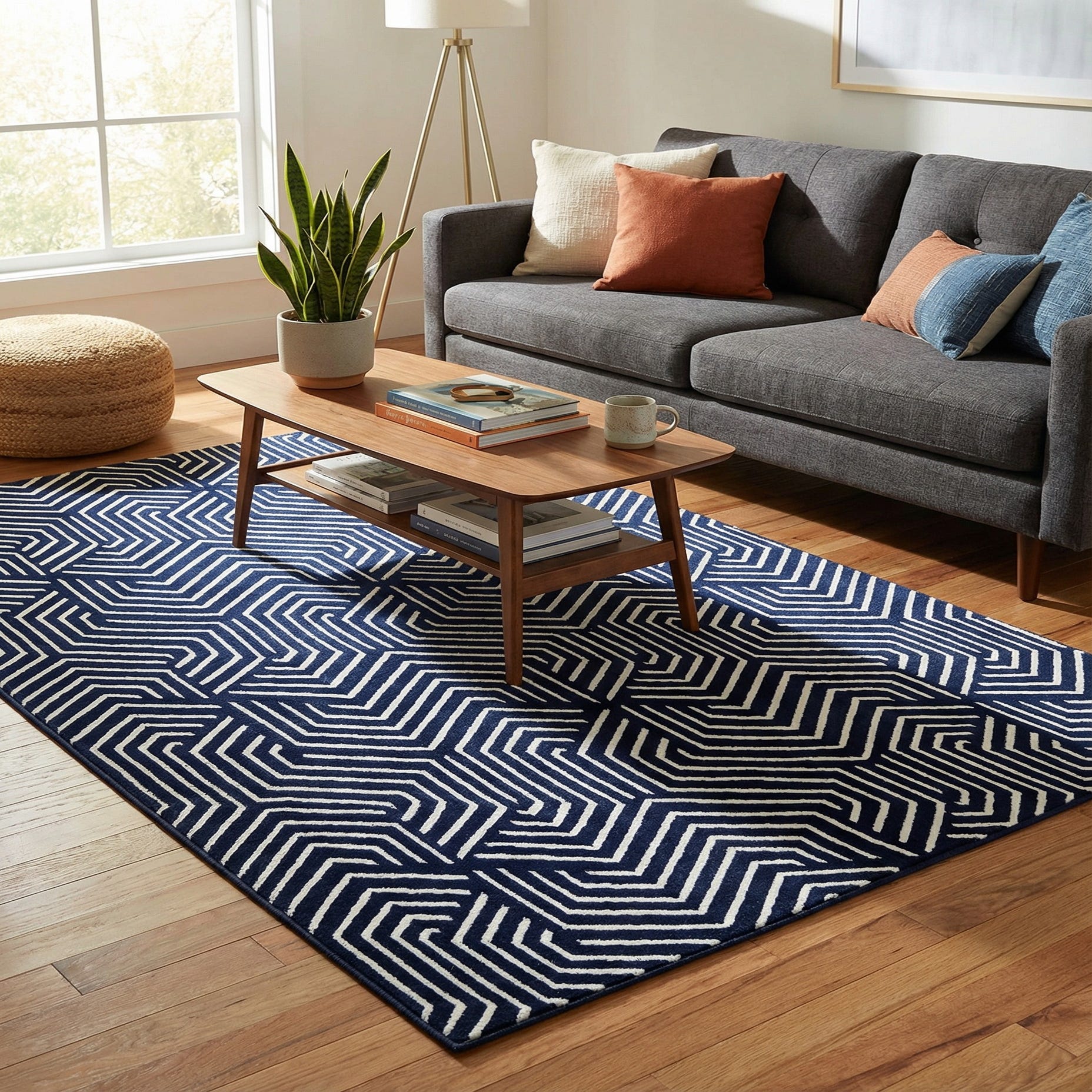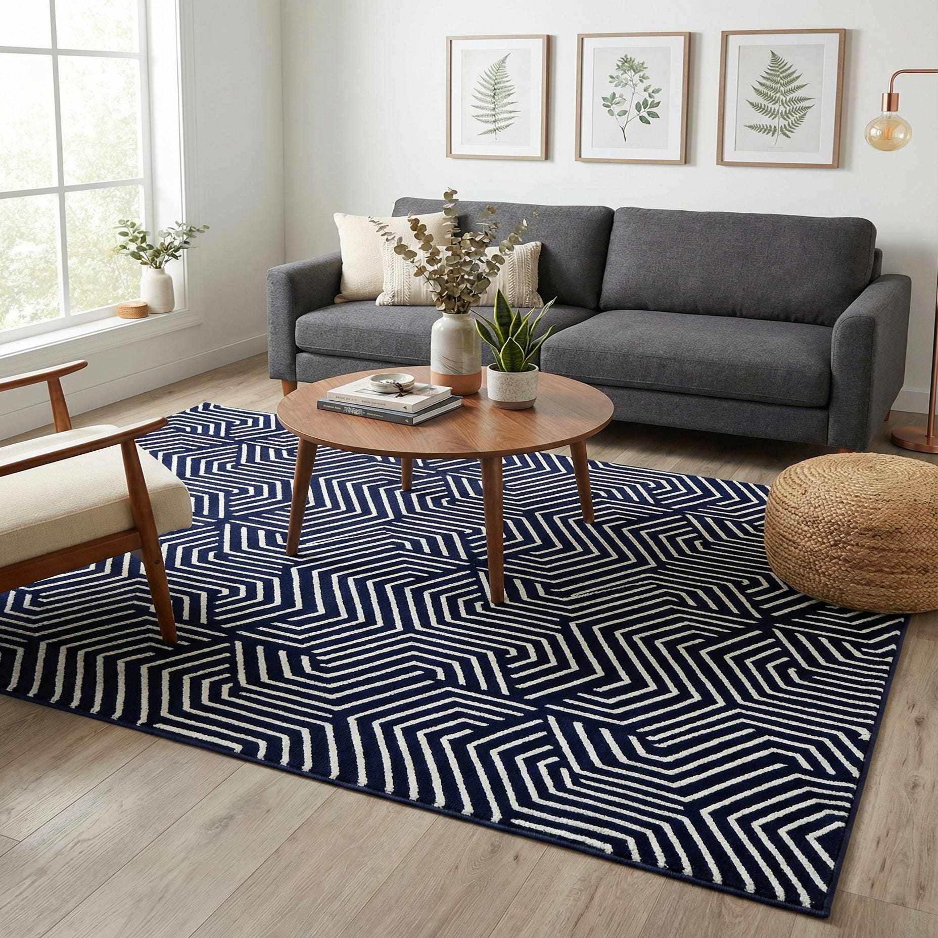 This piece works well as an anchor in contemporary living rooms beneath a coffee table, as a grounding layer at the foot of a bed, or in a home office to define a seating area. The midnight blue and ivory palette pairs naturally with light woods, white or neutral upholstery, and metal accents in brass or matte black, fitting coastal-modern, transitional, and mid-century inspired interiors. Its structured pattern and tactile chenille detail bring visual interest to high-traffic spaces that benefit from a durable, yet comfortable rug.