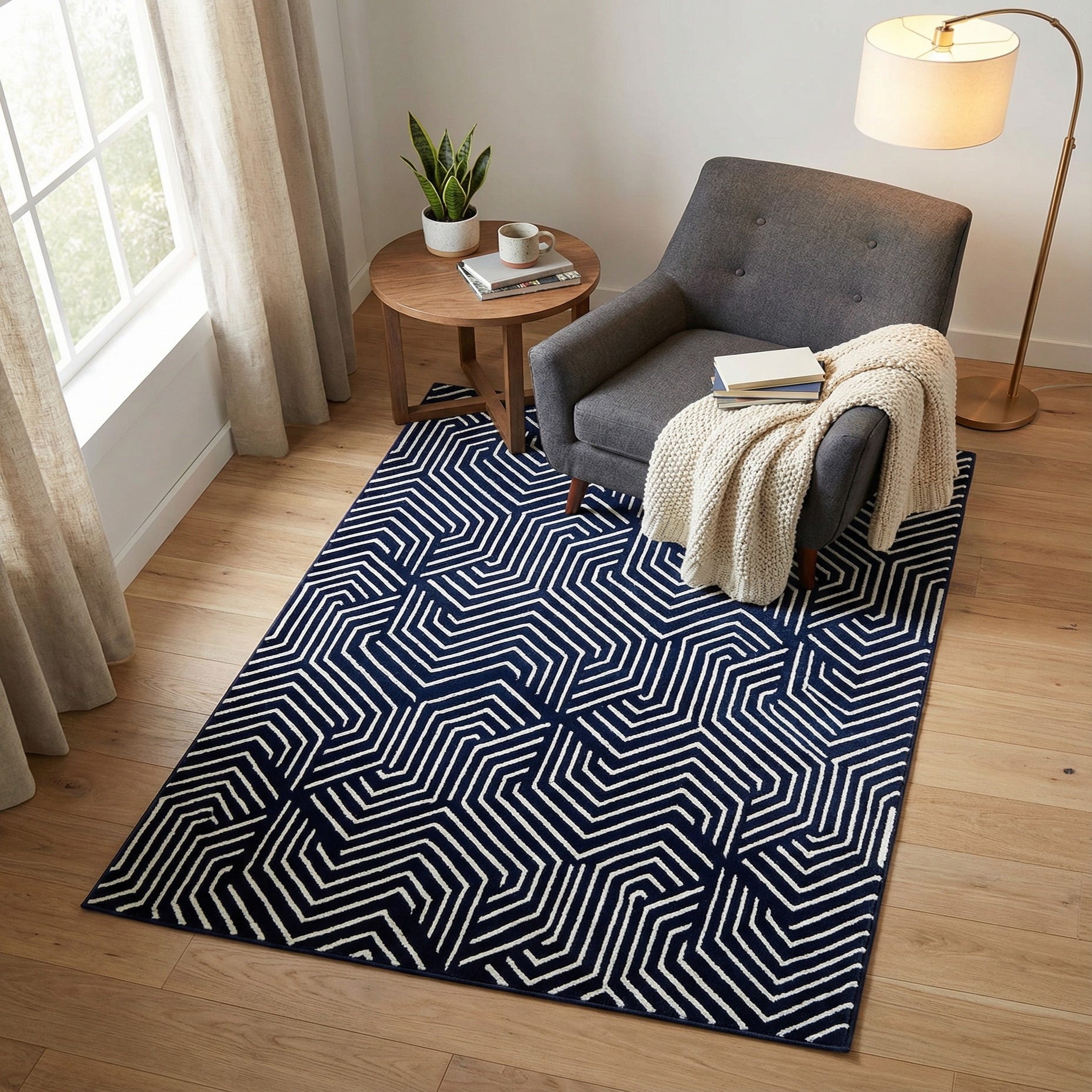 A bold geometric maze of crisp ivory lines crosses a deep midnight blue ground, forming interlocking hexagonal and chevron motifs that give the rug a modern, graphic presence. The repeating linear pattern creates steady movement without overwhelming a room, and the contrast between the ivory pattern and midnight blue background keeps the look clean and defined. Machine made from 85% polypropylene and 15% chenille, the rug has a low-to-medium pile where soft chenille ribs sit against a firmer polypropylene base, delivering a gentle, velvety hand with subtle dimensional texture underfoot.