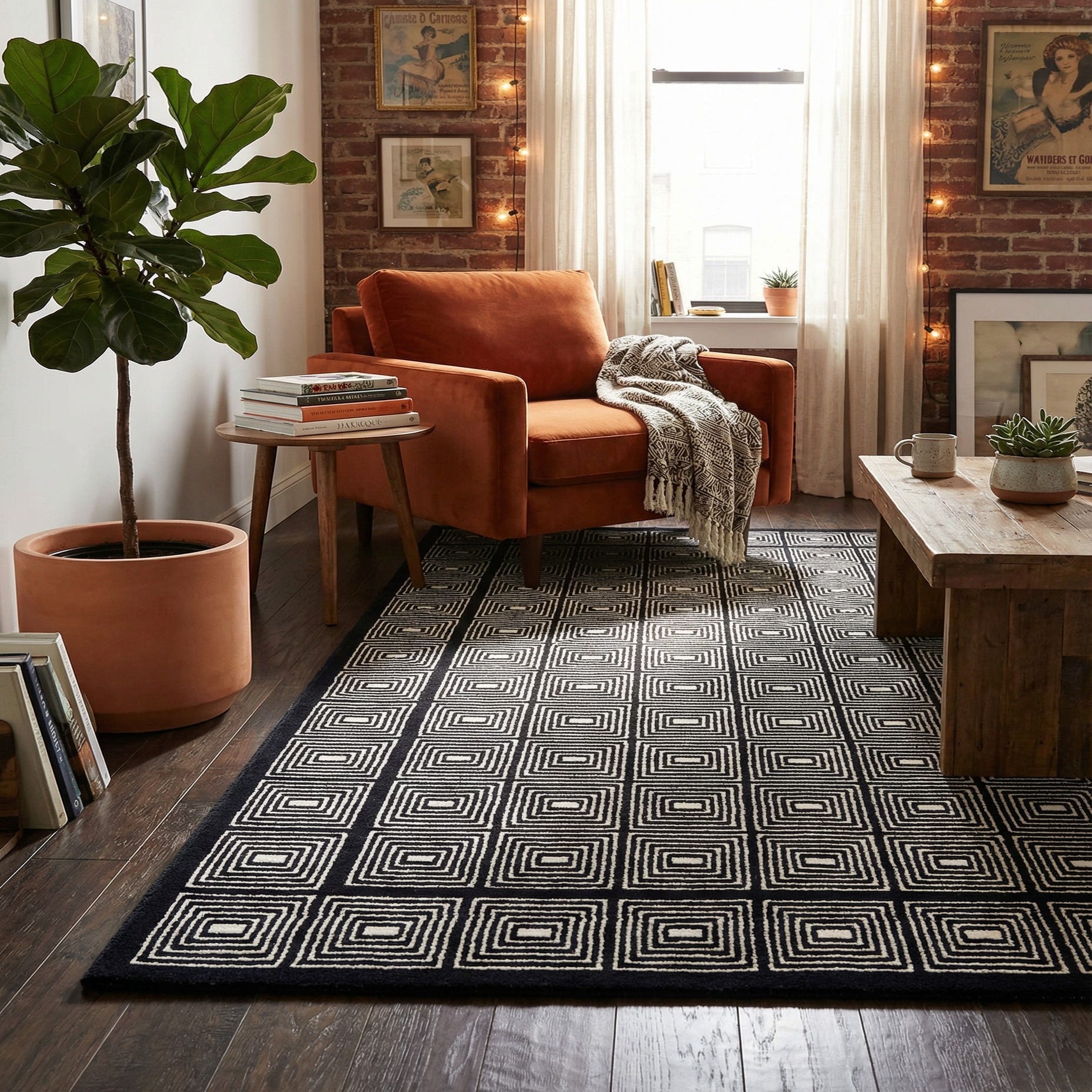 This rug pairs well with contemporary and mid-century modern interiors — imagine it anchoring a compact seating area with light wood furniture and metal accents or adding bold contrast to a neutral bedroom layered with ivory linens. It also works in entryways or home offices where a strong graphic element defines the space, and it complements navy- or coastal-inspired palettes when you want a deeper, grounding tone.