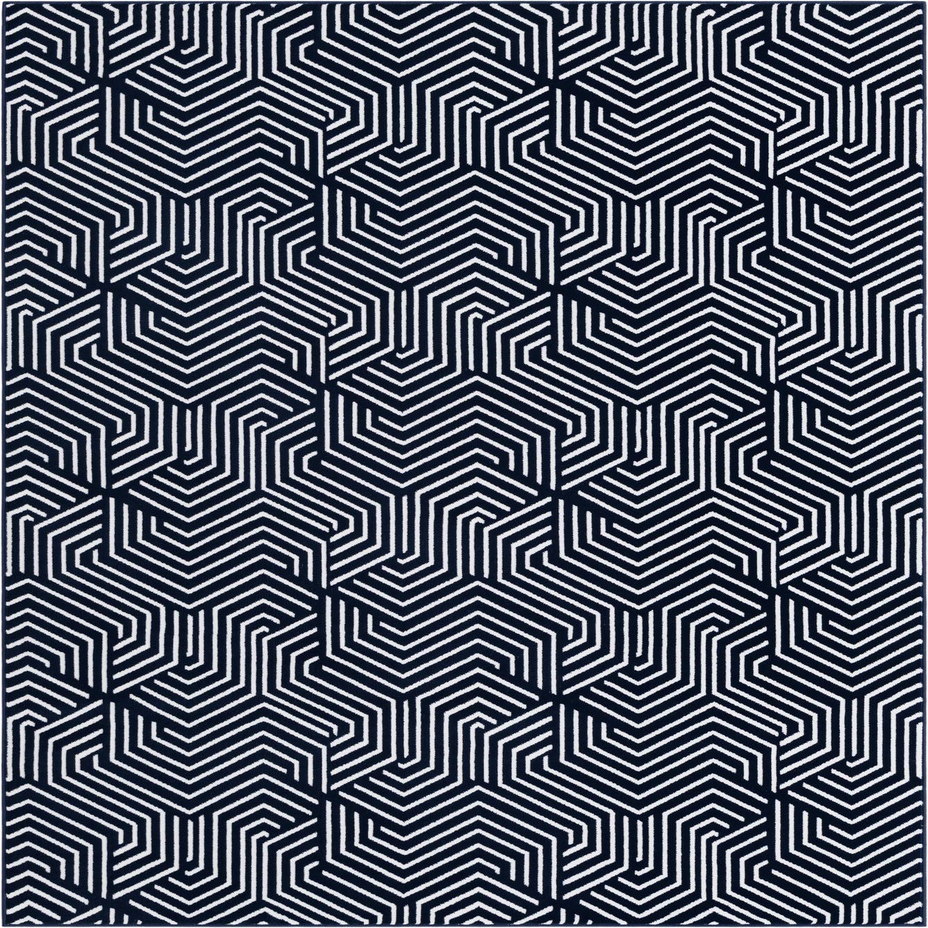 A bold geometric pattern of concentric, angular lines creates a modern, maze-like motif in clean Ivory against a Midnight Blue background. The repeating hexagonal forms draw the eye without overwhelming, and the precise contrast gives the rug a crisp, architectural presence. Machine made from 85% polypropylene and 15% chenille, the construction delivers a low- to medium-profile surface where the chenille provides a soft, slightly velvety hand and the polypropylene offers dimensional clarity to each stripe.