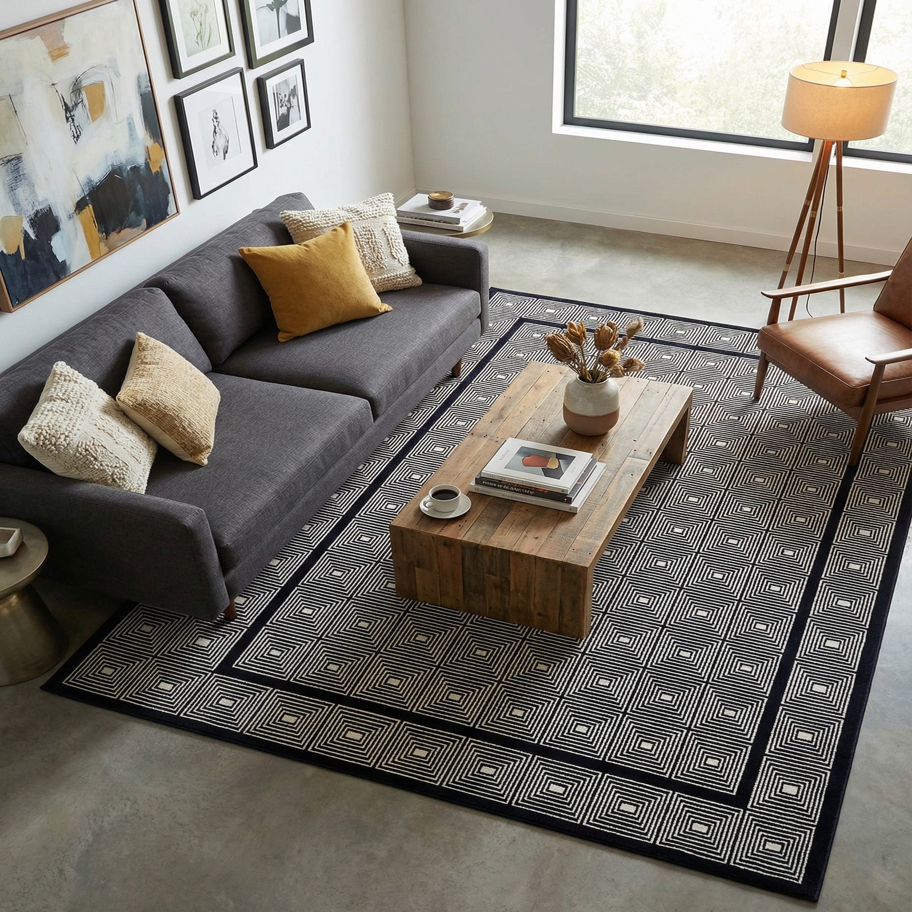 This rug pairs well with clean-lined, modern furniture and works equally with mid-century pieces or minimalist settings. Place it to anchor a seating area, beneath a coffee table to add geometric interest, or in a home office or entry where the midnight blue brings depth to the room. It complements warm wood tones, soft grays, metallic accents, and jewel-toned accessories for a cohesive, layered interior.