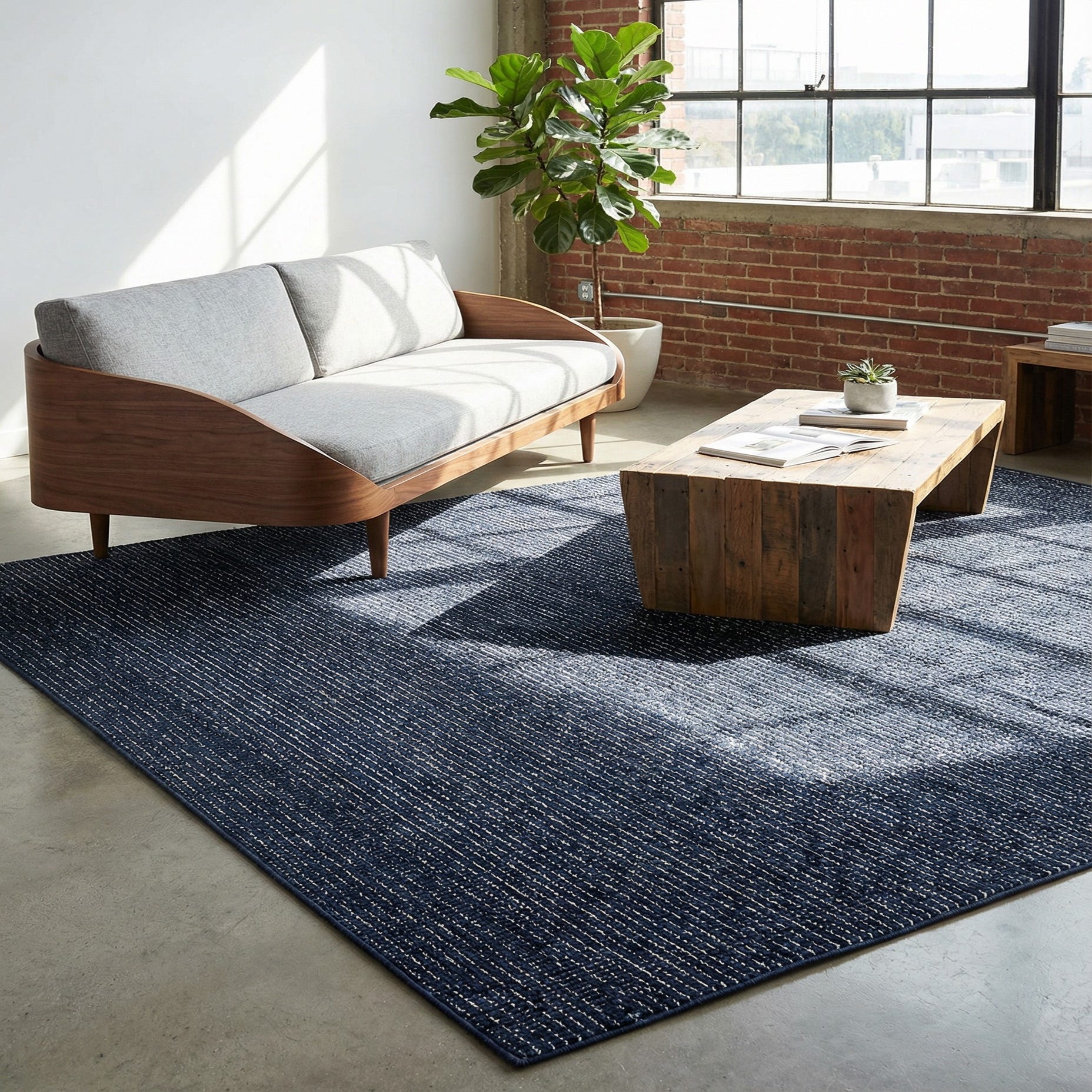 This rug anchors seating areas and bedrooms well, offering a bold but understated ground for neutral sofas, light wood furniture, or leather pieces. It pairs naturally with contemporary and transitional interiors, and works equally well in a home office or entry where a darker base can hide everyday traffic while the ivory pattern keeps the palette crisp. Match with brass or matte-black hardware and layered textiles for a balanced, finished room.