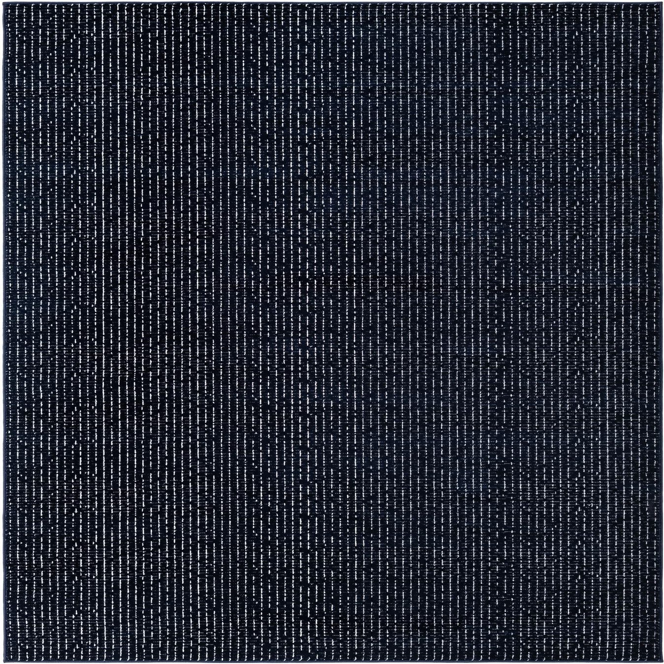 A tight, small-scale linear grid in ivory crosses a deep midnight blue field, producing a restrained, woven look that reads clean and modern. Machine-made from 85% polypropylene and 15% chenille, the surface pairs a firm, tightly woven foundation with soft chenille highlights that lift slightly above the pile. Run your hand across it and you’ll feel a low-profile cushion with velvet-like chenille accents that add visual and tactile depth without heavy texture.