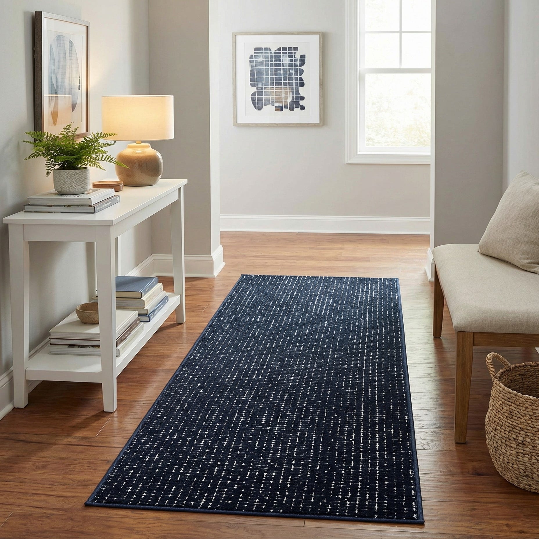 Designed as a runner, this piece anchors hallways and entryways with understated style and pairs naturally with light or warm wood floors, crisp white trim, and cool metal accents. Use it to define a long kitchen corridor, frame a console table in an entry, or add contrast along a stair landing; it also complements contemporary, transitional, and coastal-inspired interiors where a deep blue accent and subtle pattern are desired.