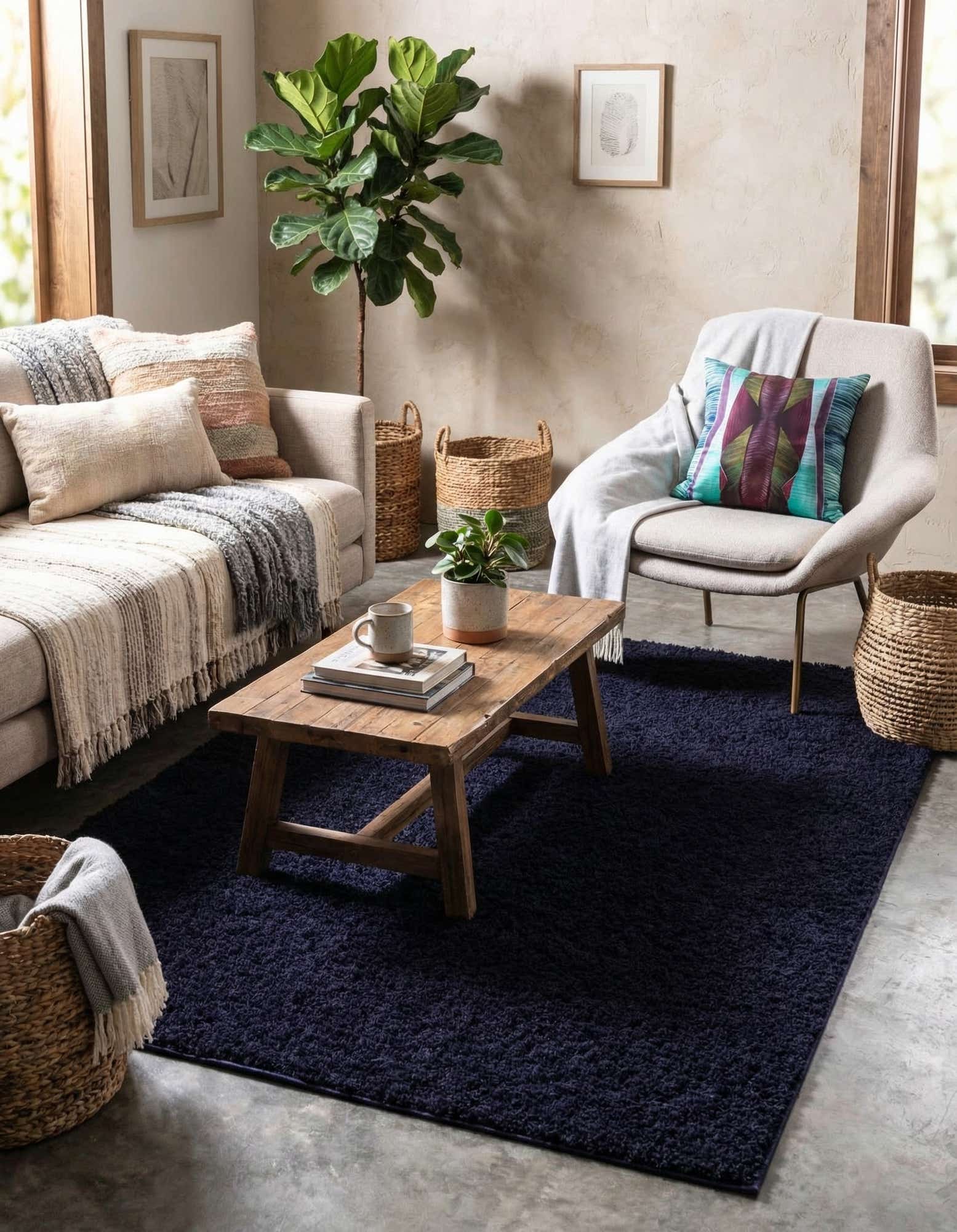 A plush, rectangular 8x10 navy blue shag rug, perfect for adding comfort and modern style to a living room or bedroom.