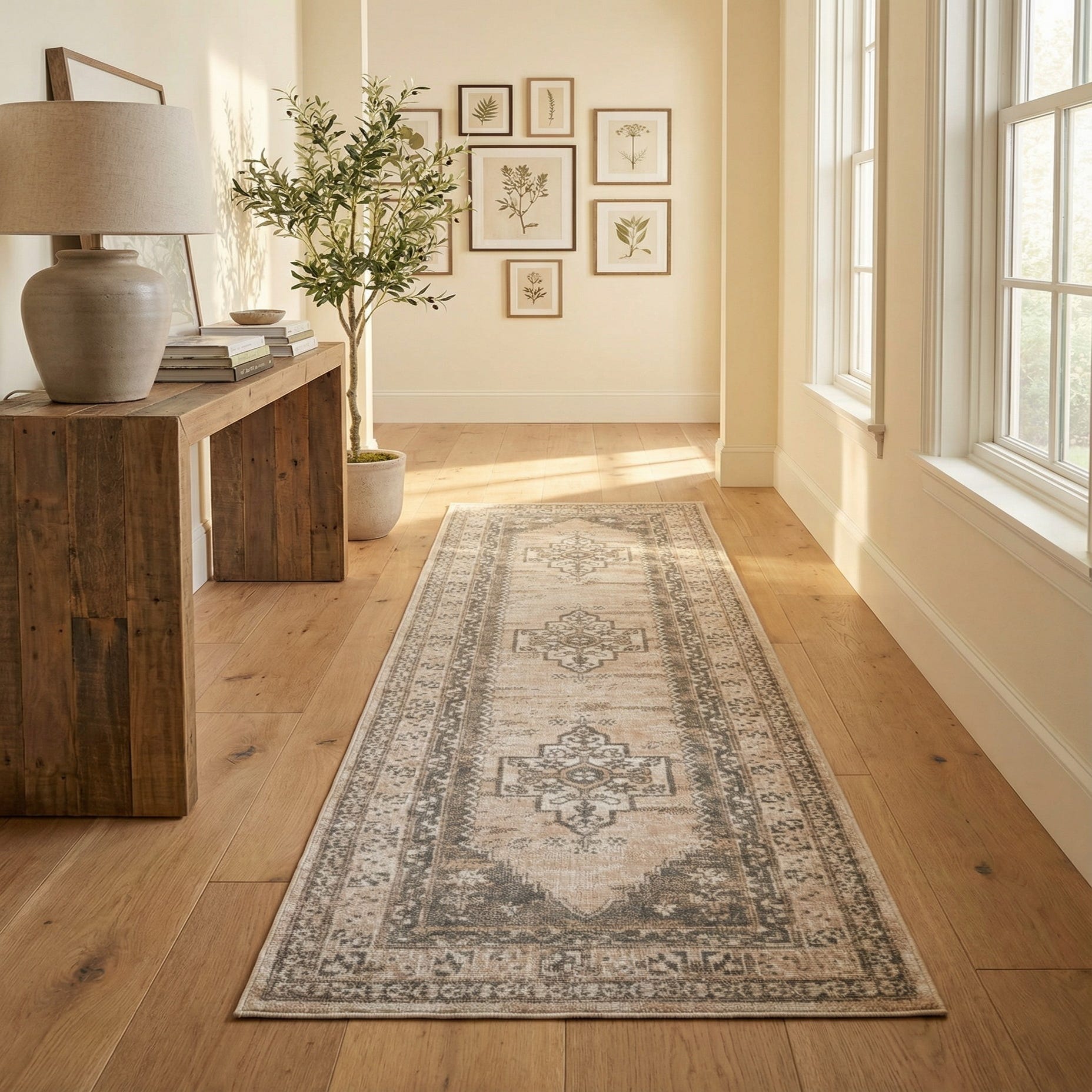Made from 100% polypropylene, the surface has a low-pile, tightly looped feel with a subtle low-sheen finish that is smooth and slightly cushioned underfoot. This runner works well in narrow spaces where you want a refined, lived-in appearance—hallways, entryways, or alongside a bed. It pairs naturally with light oak or warm wood floors, linen upholstery, and matte or aged metal accents, and will complement farmhouse, coastal, or modern-traditional interiors while tying together neutral color schemes.