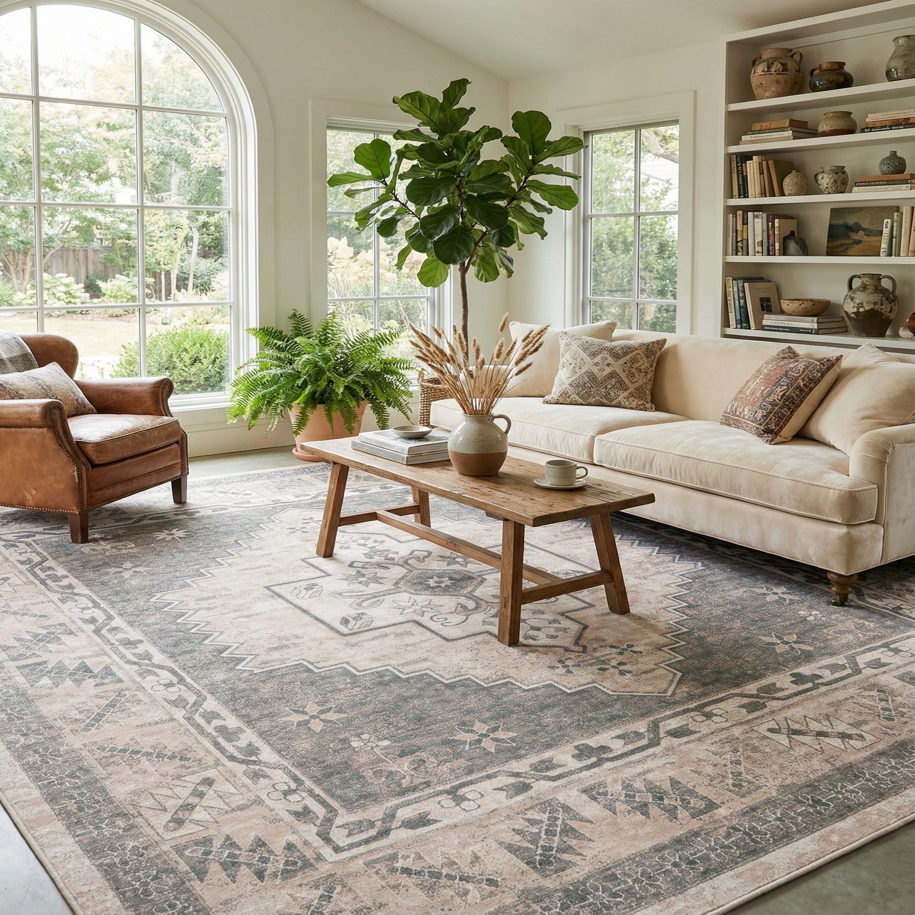 This rug's design, featuring a central geometric medallion flanked by ornate borders, lends itself to multiple interior aesthetics from classic to contemporary. Its neutral palette and subtle elegance make it suitable for anchoring living spaces, dining areas, or large foyers. Complement its mink background with natural wood tones, or pair with minimalist, monochromatic furniture to allow the intricate pattern to serve as a focal point. This piece achieves a harmonious balance between sophistication and functionality, making it an adaptable choice for an array of interior settings.