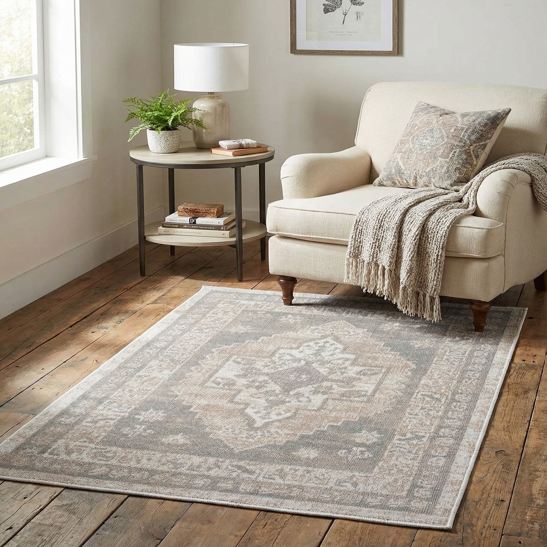 A softly weathered central medallion and stepped border define this rug, set against a mink background with ivory and light brown accents. The pattern draws on traditional motifs with a faded, vintage-inspired finish that gives the design gentle depth without heavy contrast. Machine-made from 100% polypropylene, the surface has a low, even pile you can feel under your hand—tight weaving creates subtle texture and a smooth, slightly matte look.