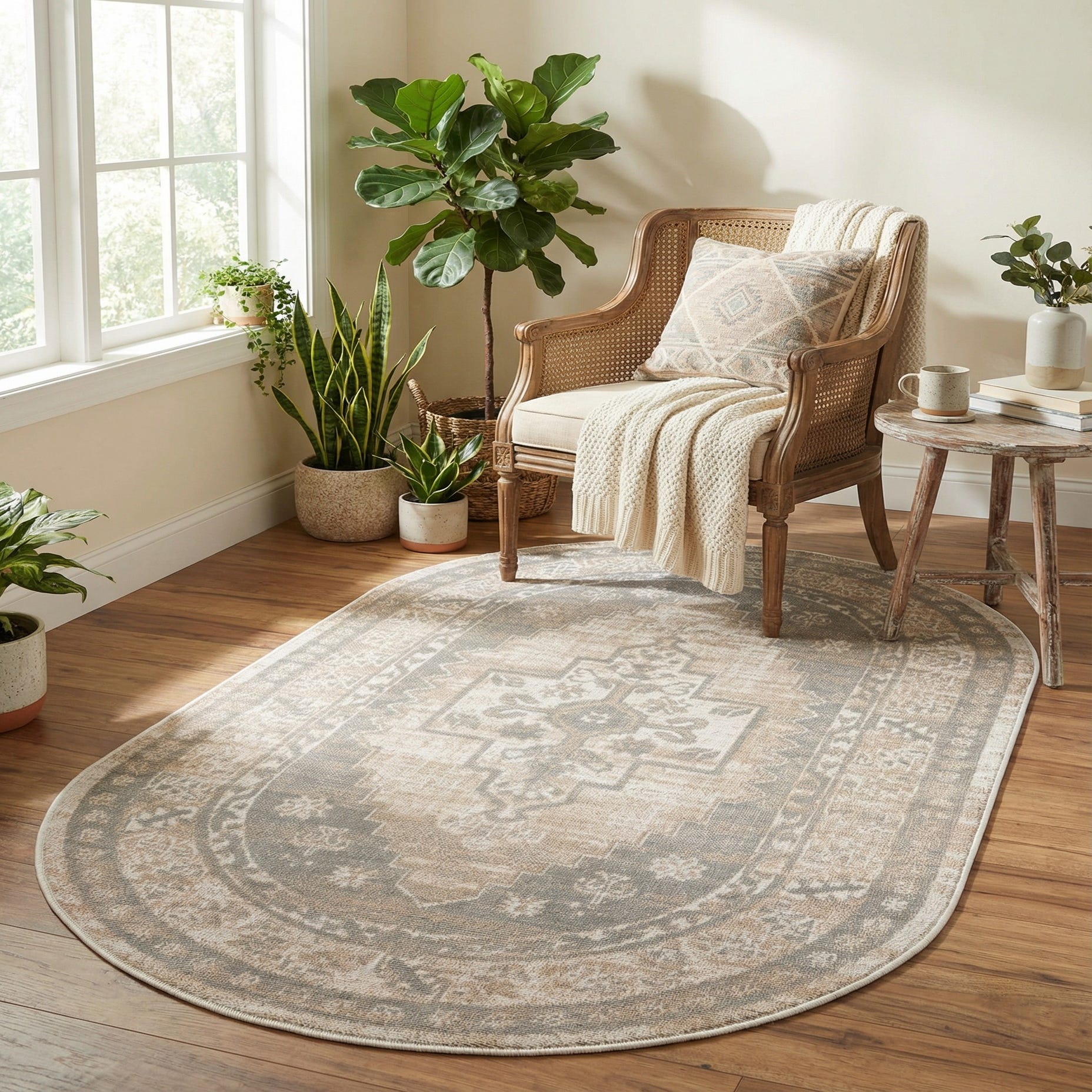 This oval shape works well in compact or transitional spaces: place it in an entry or foyer to set a welcoming tone, tuck it beneath a small round dining table or breakfast nook, or layer it at the foot of a bed to add warmth to a bedroom. Its neutral palette and vintage-inspired motif complement modern farmhouse, contemporary-traditional, or Scandinavian interiors, and it pairs naturally with light wood floors, linen upholstery, and metal or rattan accents.