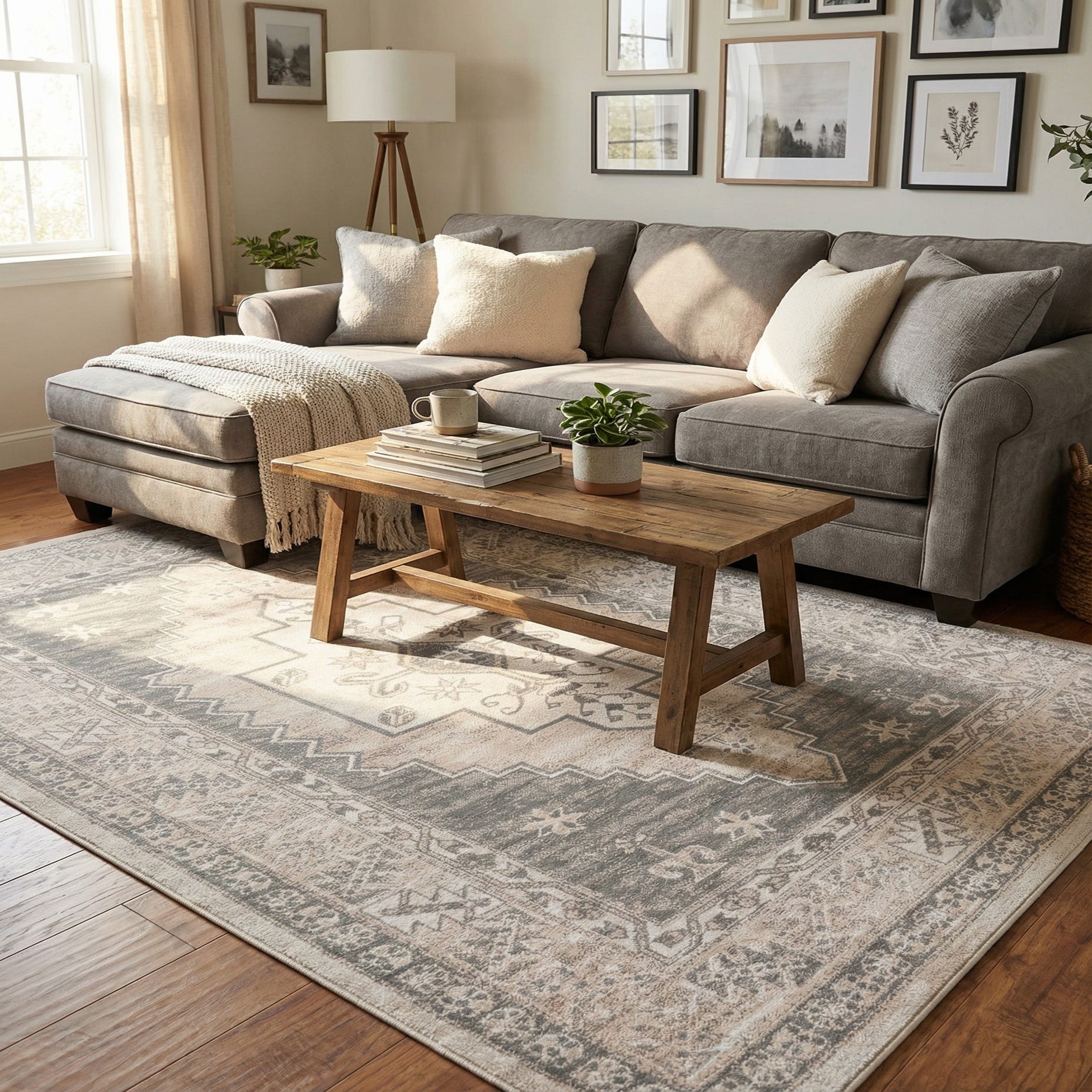 Machine-made from 100% polypropylene, this rug lays flat and works well where you want pattern and texture without added height—think layered under a coffee table in a casual living room, anchoring a sitting area, or running the length of a hallway. Its neutral mink palette complements warm woods, painted furniture, and soft textiles, making it a good match for transitional, modern farmhouse, Scandinavian, or softly bohemian interiors.