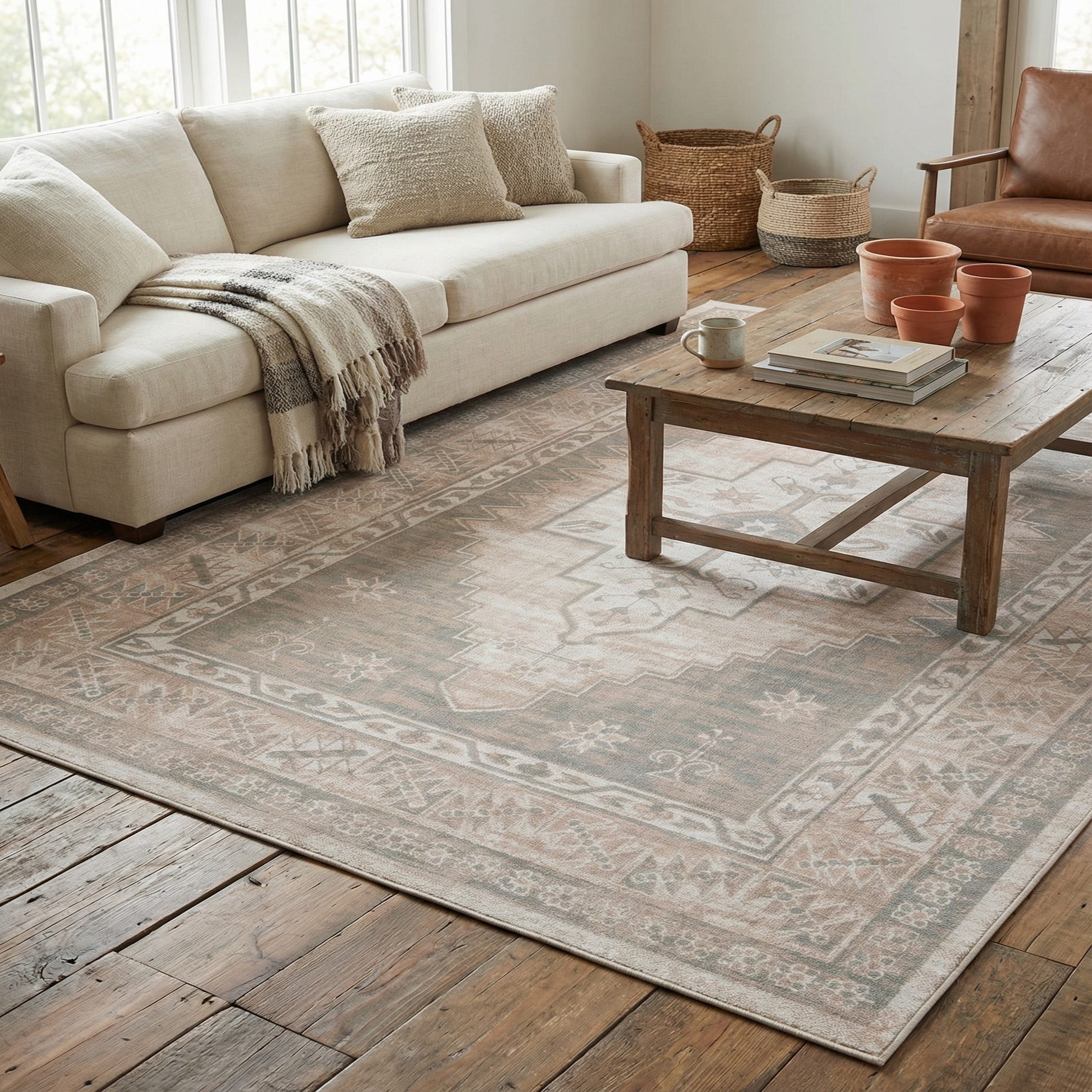 A stepped medallion sits at the center of a traditionally inspired field, surrounded by a layered guard border of geometric and floral motifs. The background is Mink, with Ivory, Light Brown, and Gray used for the central medallion and delicate accent details, creating a quietly layered, slightly antiqued look. Machine-made from 100% polypropylene, the rug has a low, even pile with a smooth hand and a subtly brushed surface that feels comfortable underfoot while keeping pattern clarity across the weave.