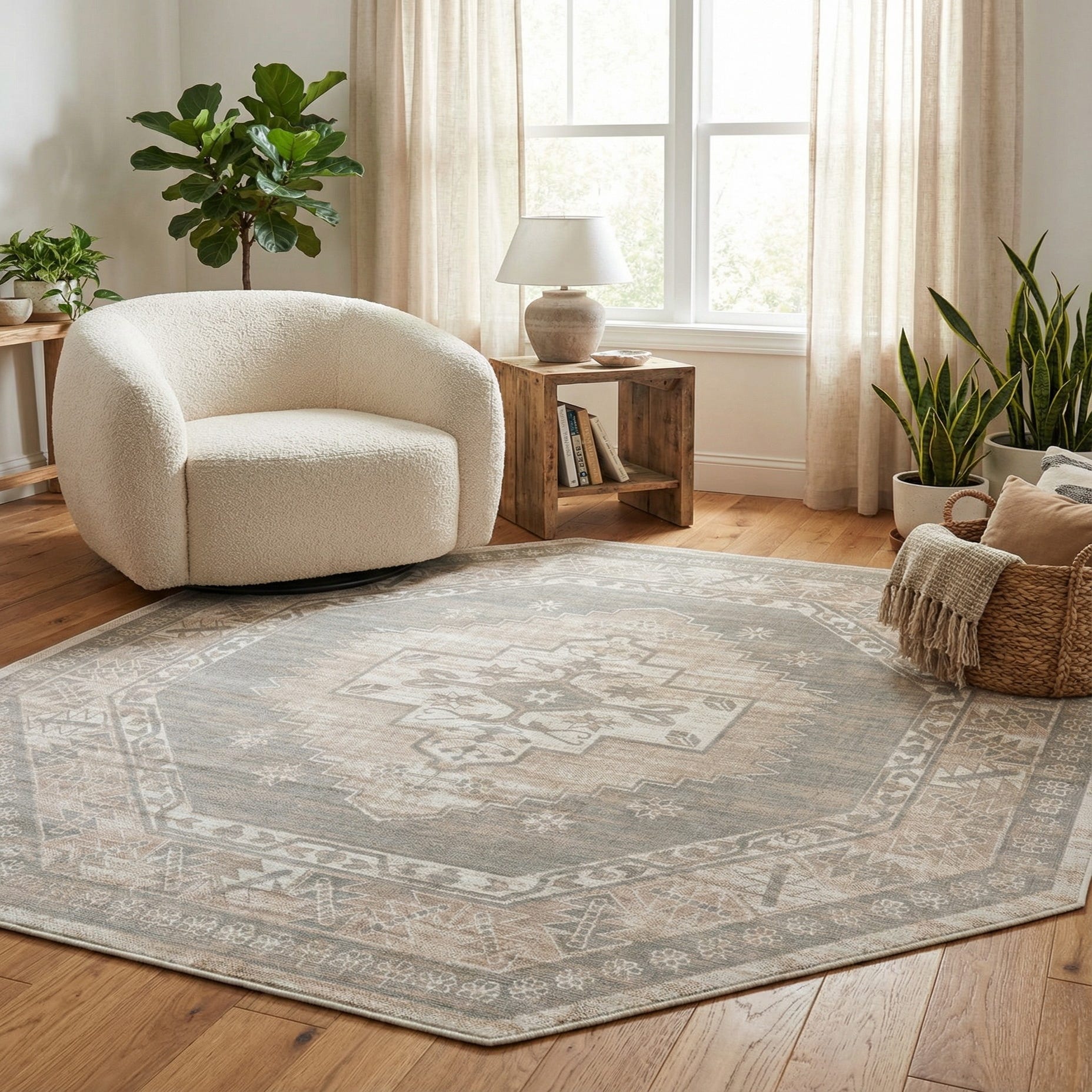 An octagonal rug with a softly worn medallion at its center, this piece blends geometric and floral motifs for a grounded, traditional look. The mink background provides a warm, neutral field while ivory and light brown highlights trace the stepped central medallion, star accents, and the layered border of intricate tribal-inspired patterns. The finish has a gently distressed appearance, giving the design an aged, lived-in character without strong contrast.
