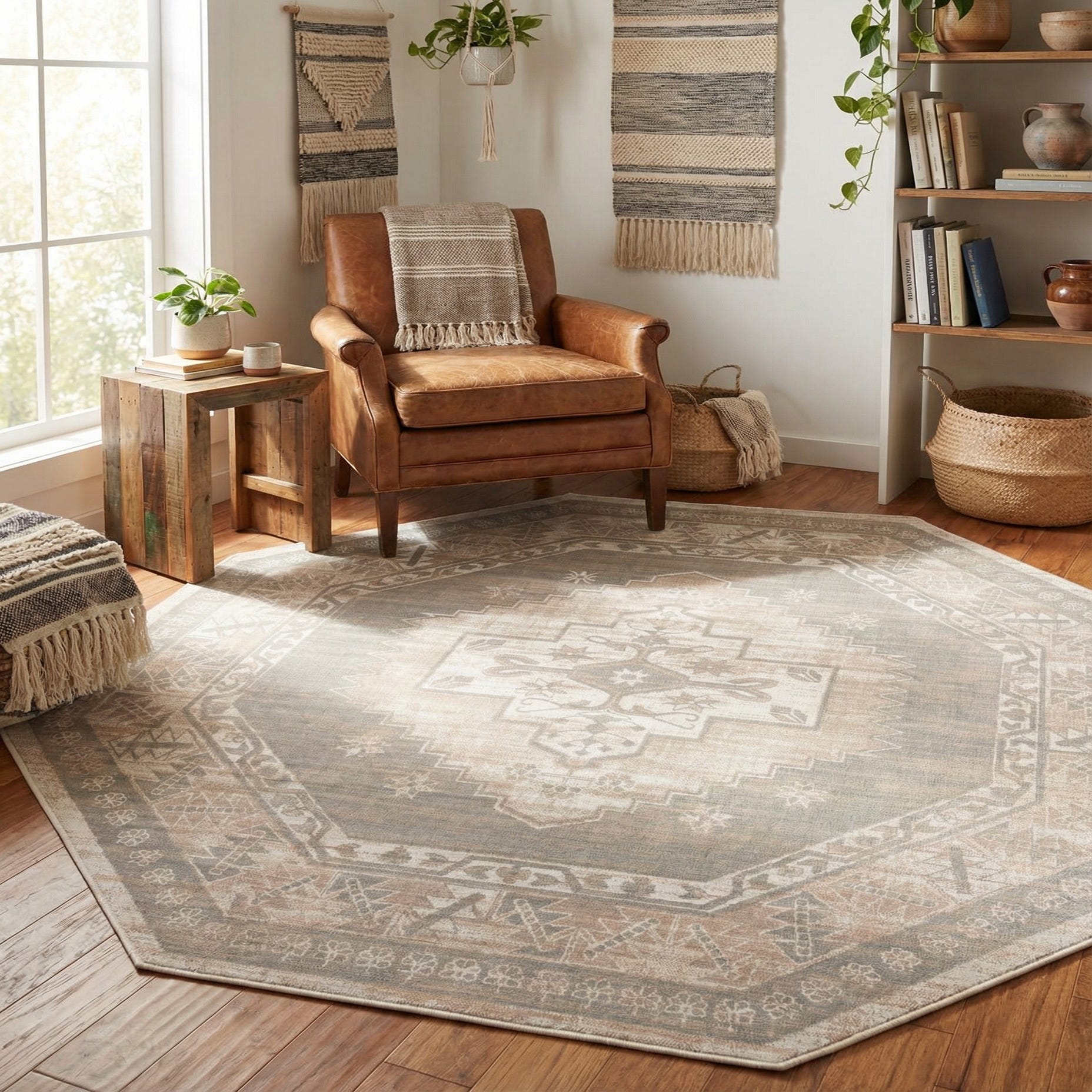 This rug is designed to adapt seamlessly to different interior scenarios, from grounding a classic living room ensemble to adding warmth to a minimalist space. Its generous octagonal shape and neutral tone palette make it exceptionally versatile, aligning well with wood finishes, metallic accents, and a broad spectrum of color schemes.