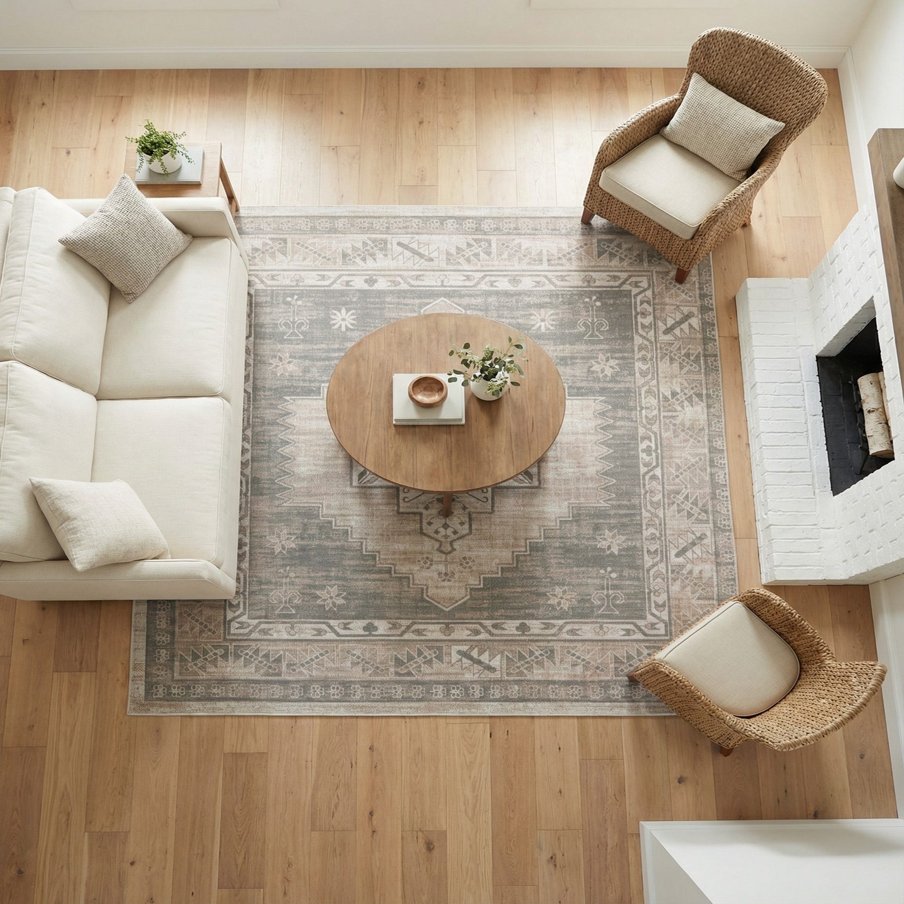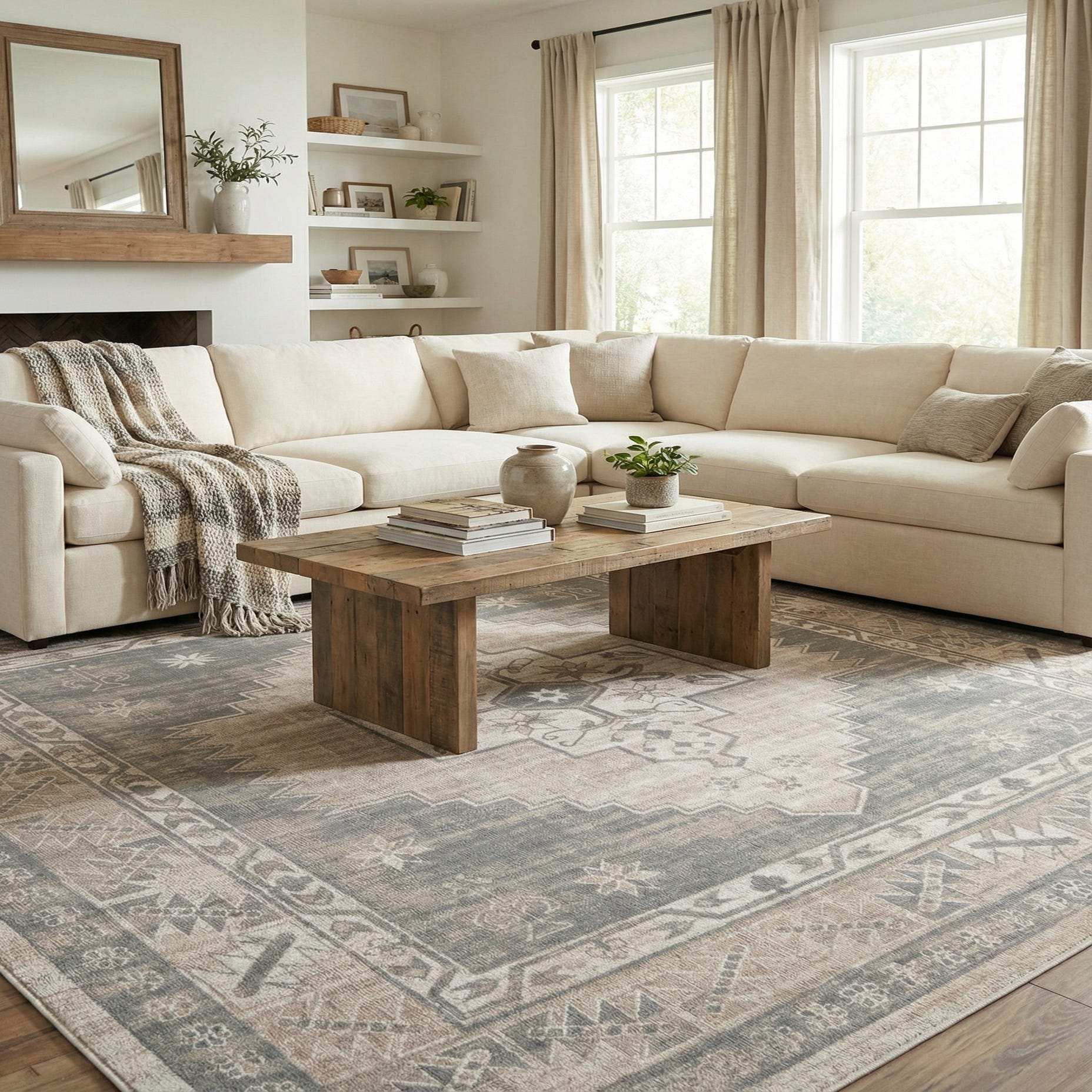 This piece works well in neutral, understated interiors — think modern farmhouse, transitional, or casual contemporary schemes. It will ground a seating area or sit neatly under a square dining table, and it pairs easily with natural woods, linen upholstery, and matte metal accents. The polypropylene construction makes it a practical choice for family rooms, home offices, or bedrooms that need pattern and warmth without overpowering the room.
