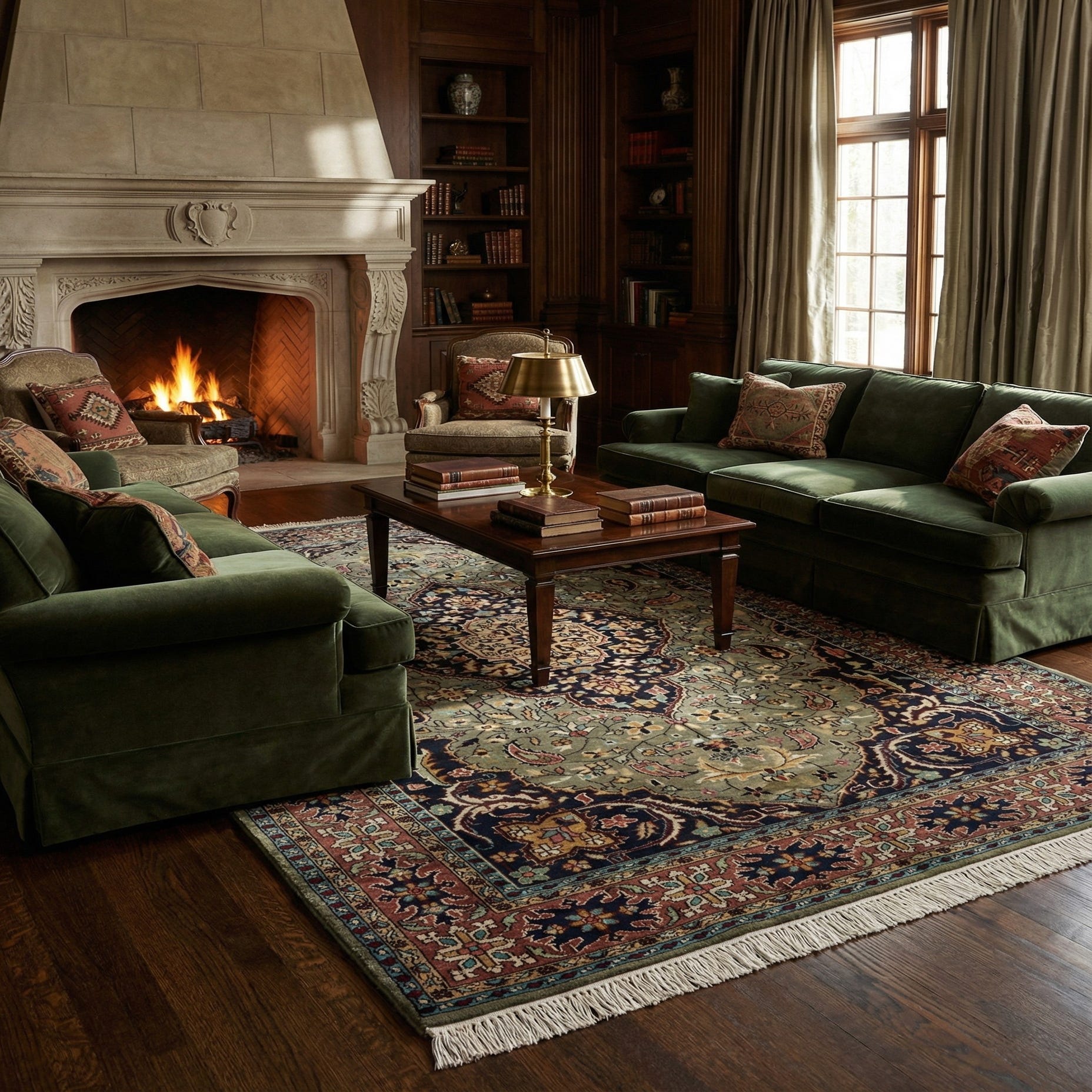 A 5x8 rectangular Bokhara rug with a traditional medallion pattern in shades of green, navy, and red, featuring fringe.