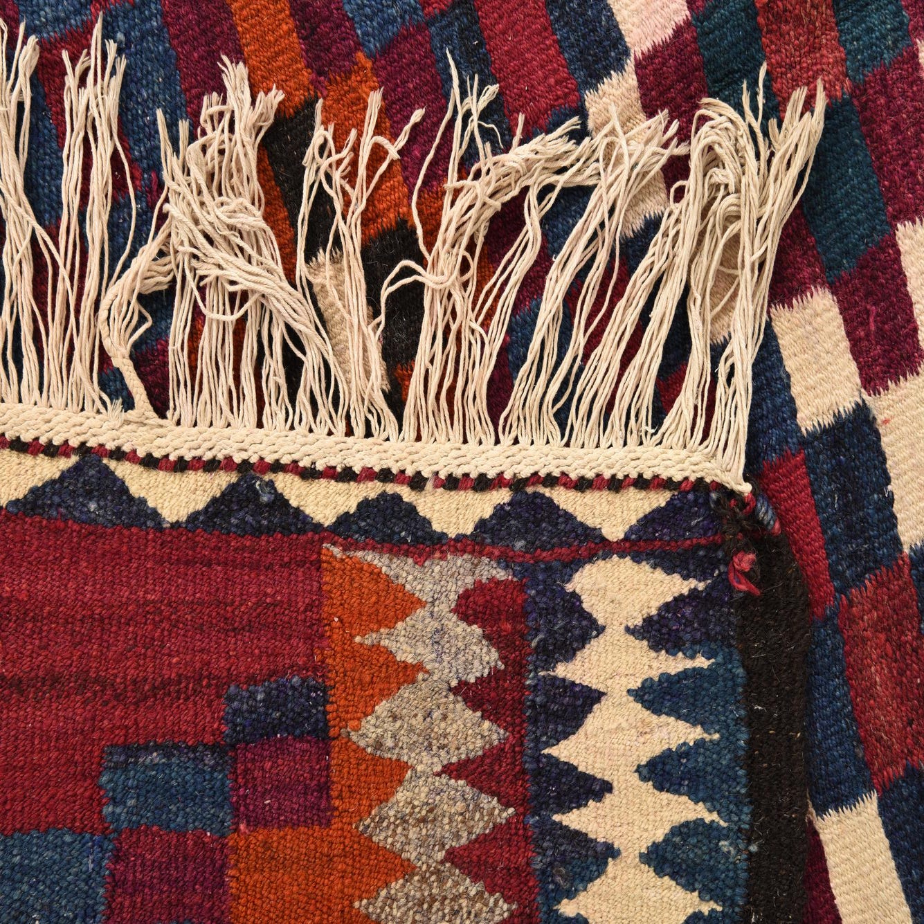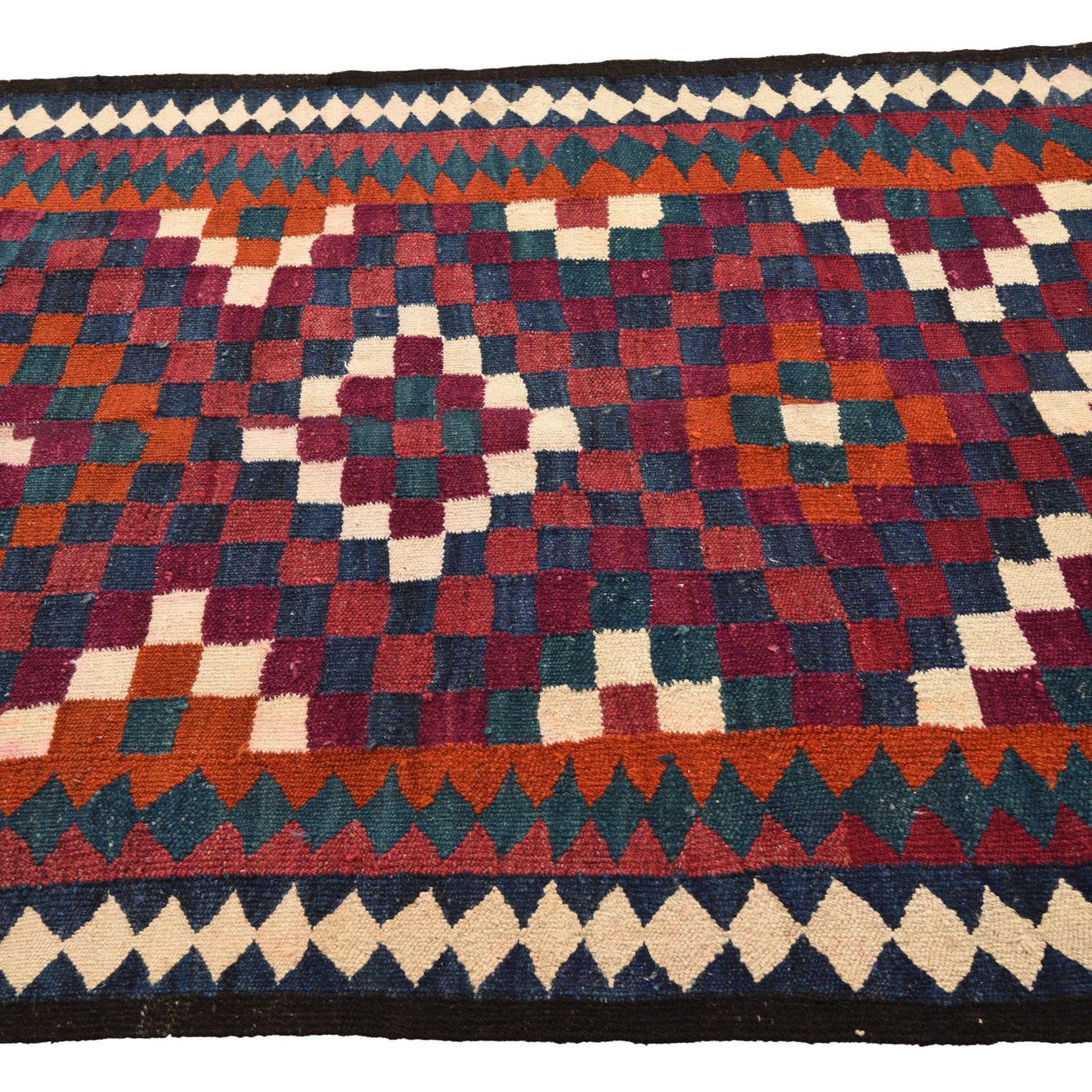 The Kilim Fars 10 Ft Runner is a hand-woven rug crafted from 100% wool, boasting a strong presence with its rich visual texture and color. Its multi-colored background harmoniously blends with prominent hues including black, ivory, maroon, navy blue, and orange, creating a vibrant, geometric chequered pattern that is both traditional in essence and bold by design.