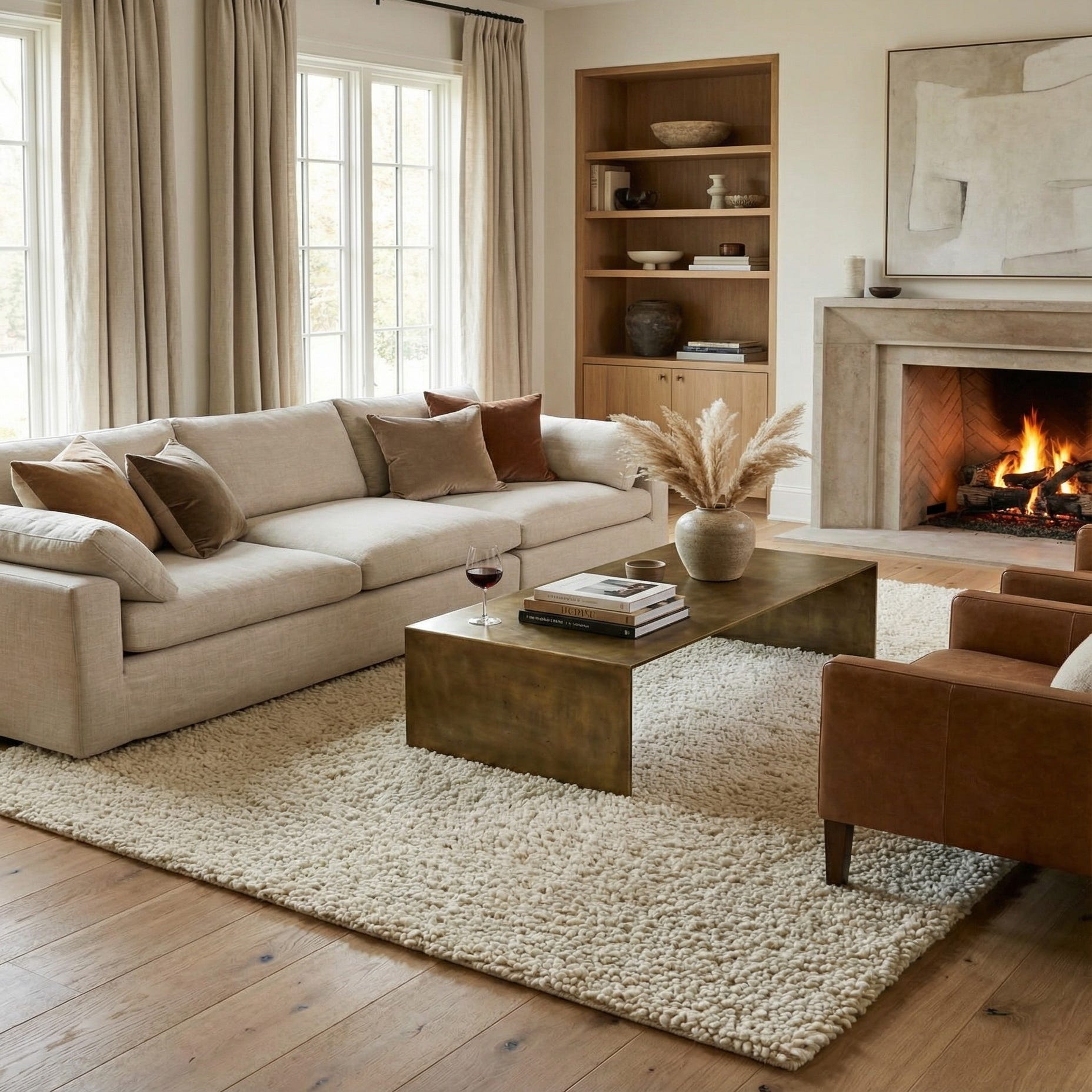 Underfoot the pile is plush and springy, with a dense, tactile texture that cushions and insulates a room. Use it as the grounding layer beneath a seating group in a living room, layered at the foot of a bed to add warmth to a bedroom, or as a calming base in a large, open-plan space. It pairs naturally with light woods and linen upholstery for Scandinavian or coastal interiors, and also complements leather or mid-century modern furnishings when you want a softer, neutral counterpoint.