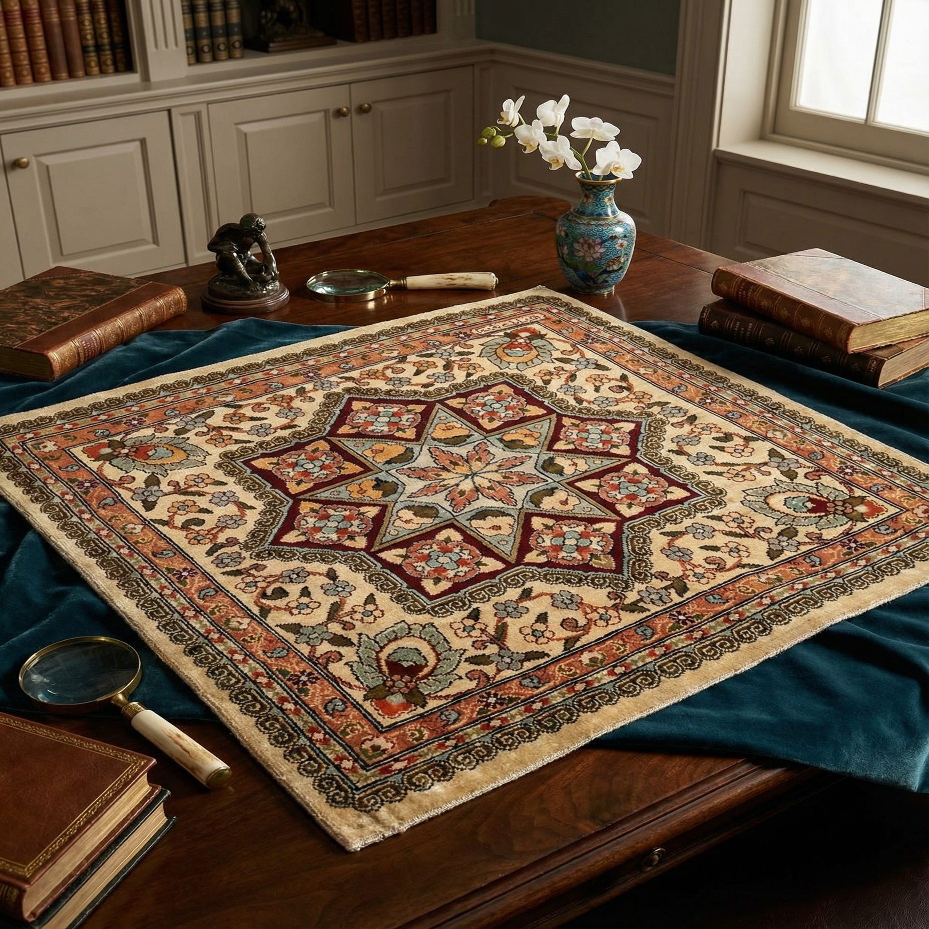 With its compact size and elaborate craftsmanship, this rug is well-suited as an accent piece for a variety of interior settings. It can serve as a sophisticated touch in a traditional study, as a centerpiece in a quiet reading nook, or as an ornate addition to a collector's display cabinet. Its elegant patterns and luxe texture make it a versatile choice for those looking to add a touch of refinement to their space without overwhelming it.