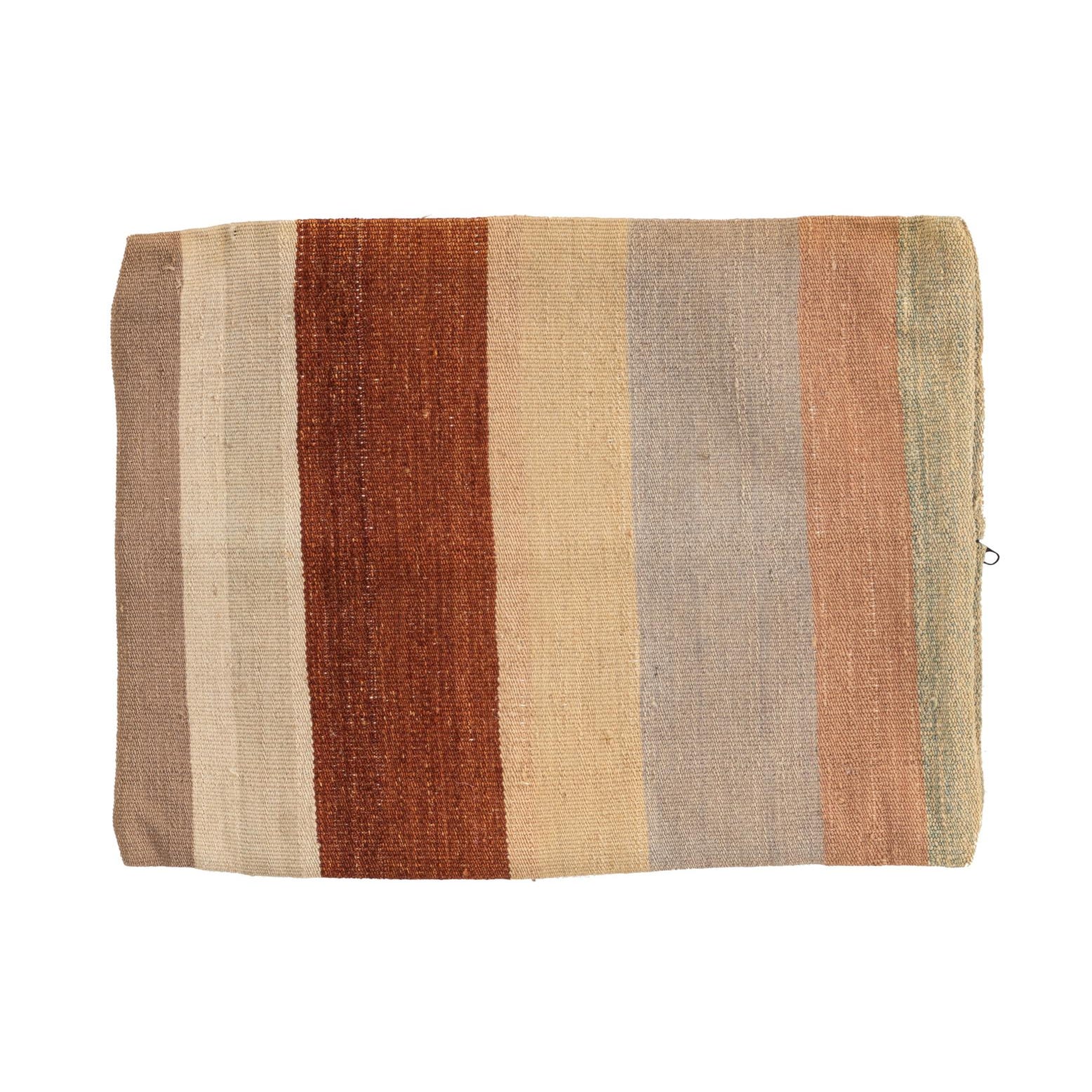 A square, multi-colored wool rug featuring vertical stripes in shades of brown, beige, grey, and rust.