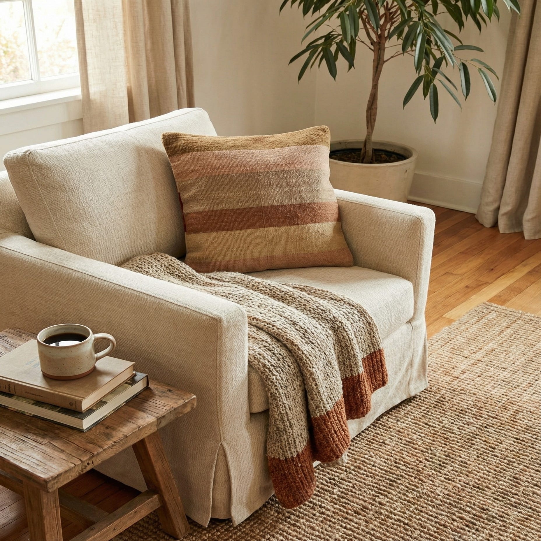 A square, multi-colored wool rug featuring horizontal stripes in shades of brown, beige, and pink, with a hint of red on the left edge.