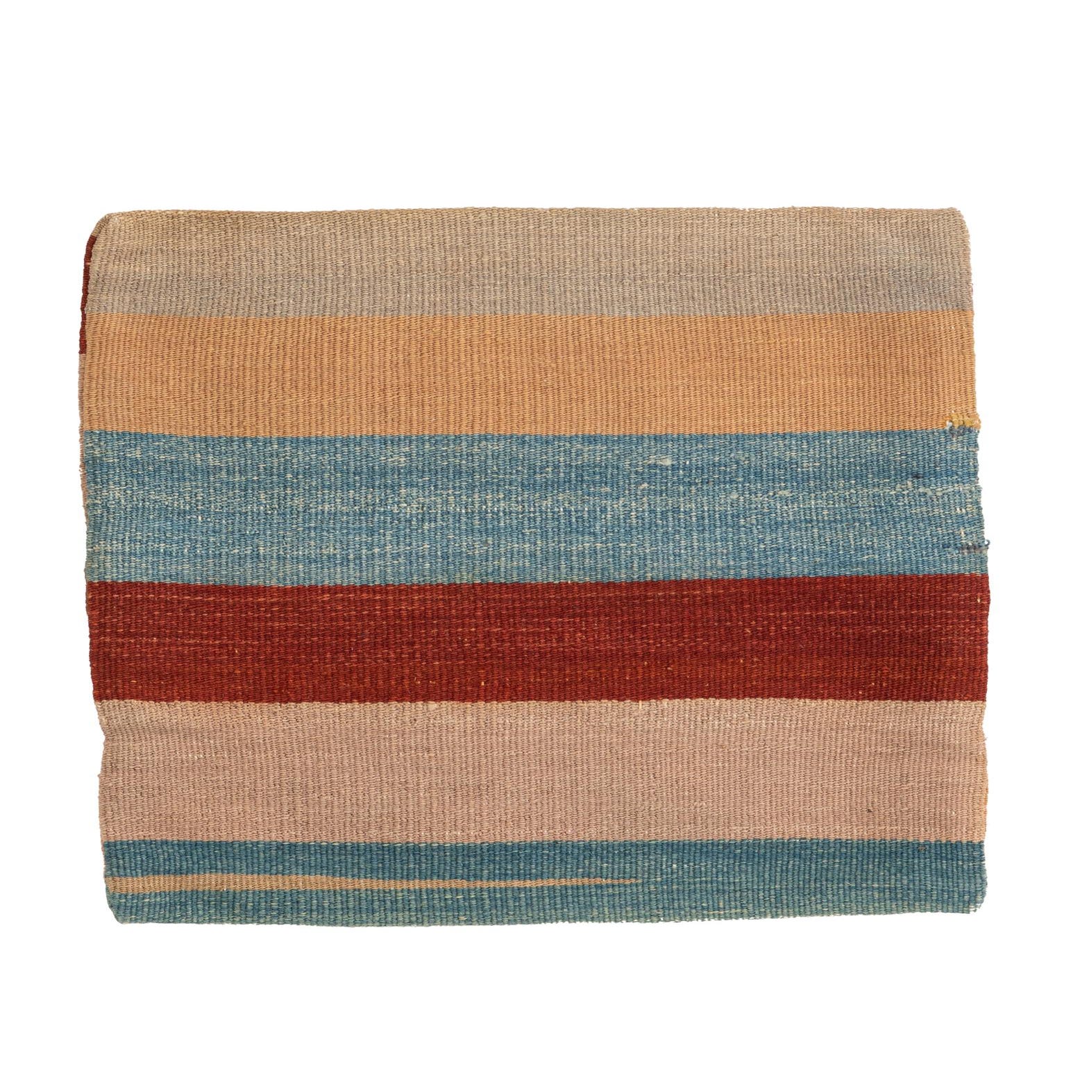 A square, multi-colored wool rug featuring horizontal stripes in shades of blue, red, peach, and beige.