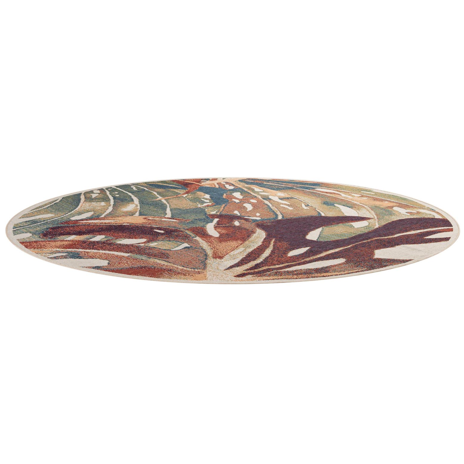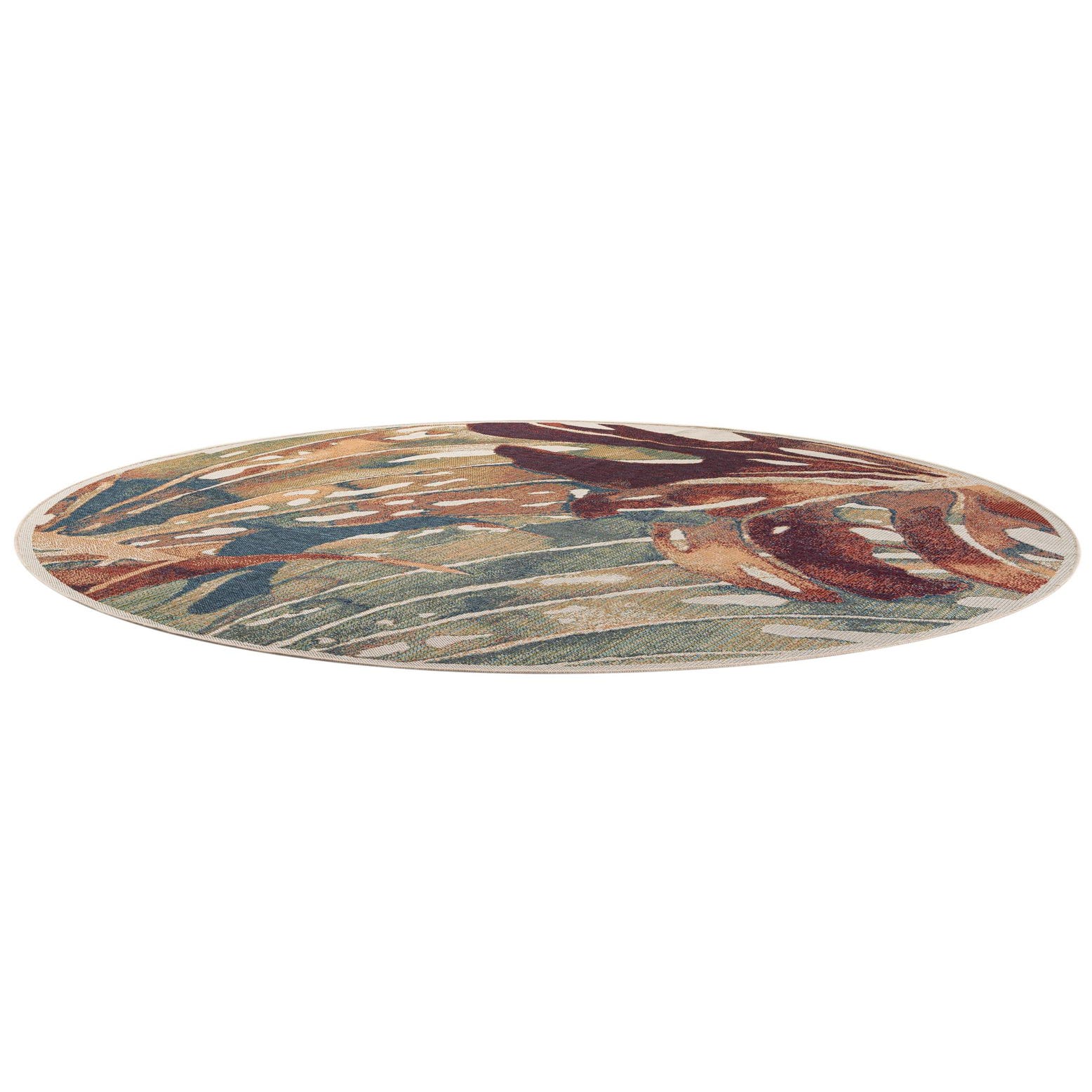 A 10-foot round multi-colored botanical rug with large green, orange, and brown leaves, suitable for indoor or outdoor use.