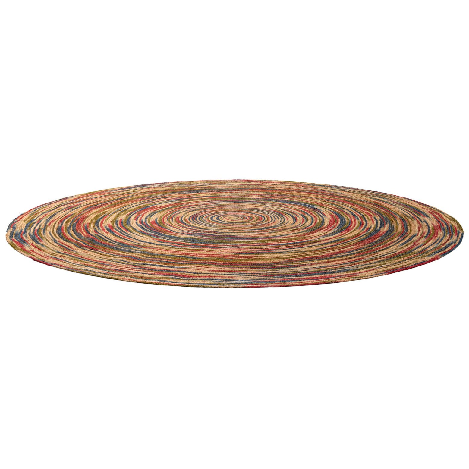 A 10-foot round Braided Jute rug by Rugs.com, featuring a multi-colored spiral pattern in red, blue, and green on natural jute.