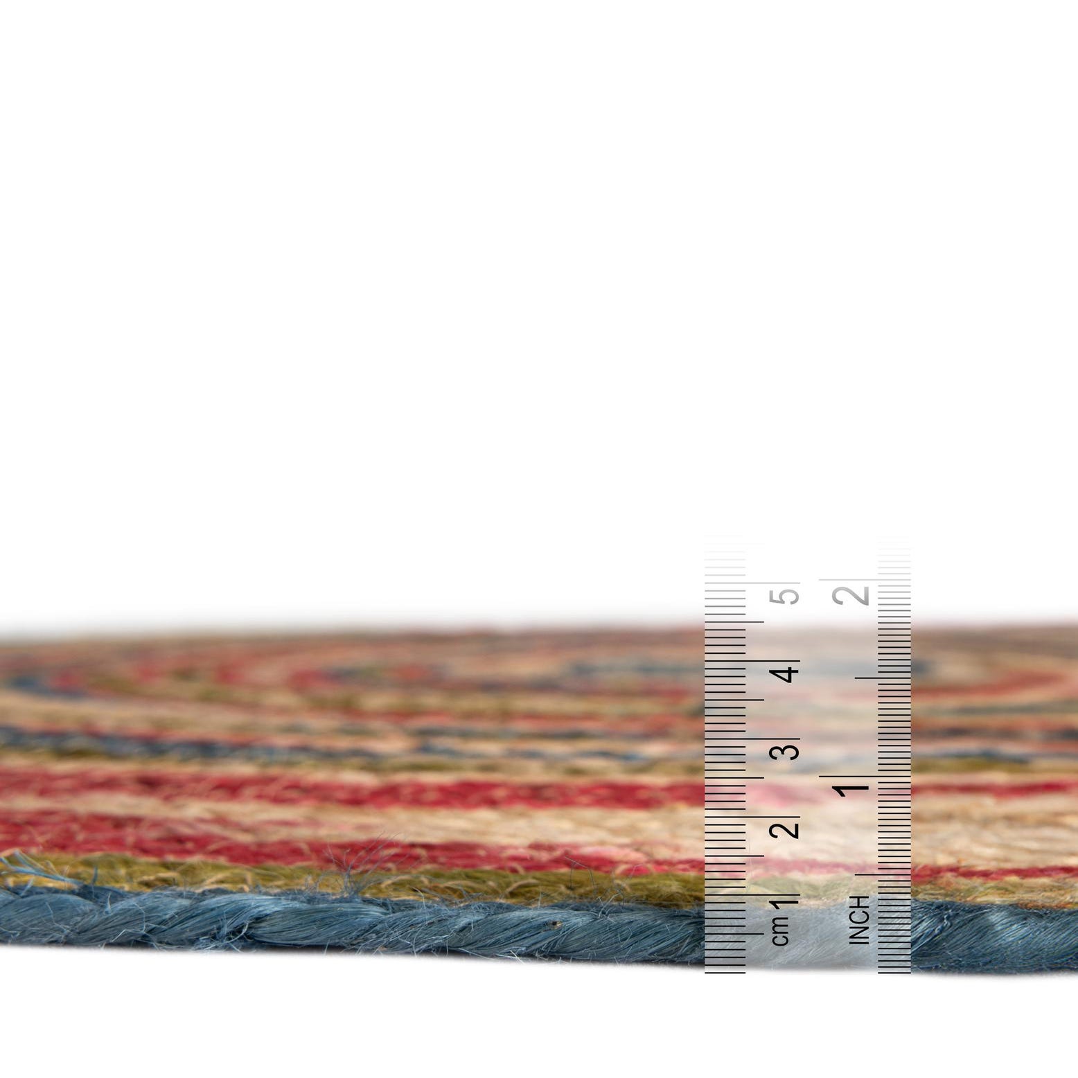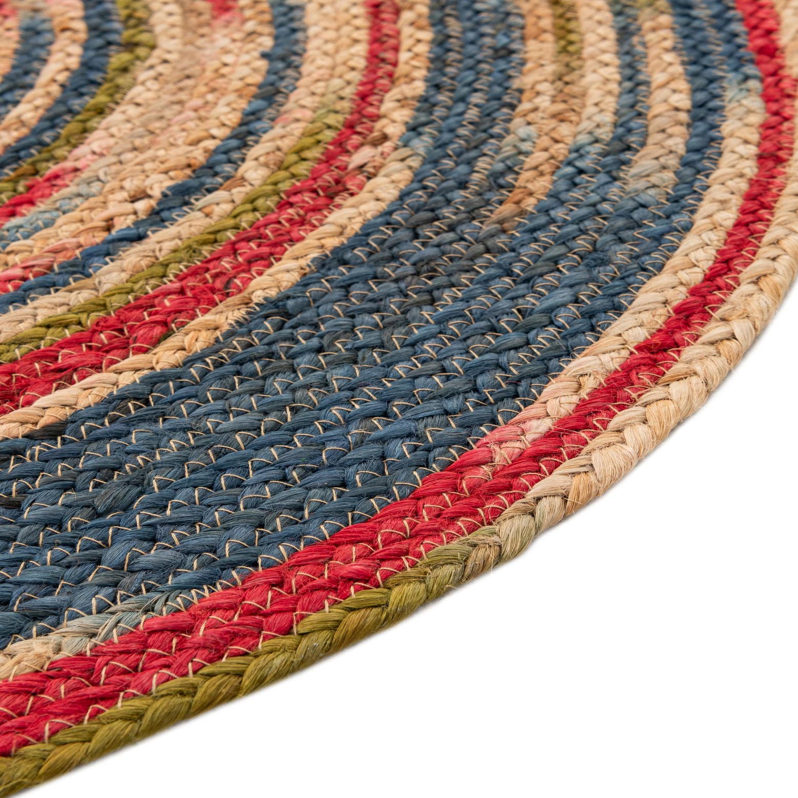 A 10-foot round Braided Jute rug by Rugs.com, featuring a multi-colored spiral pattern in red, blue, and green on natural jute.