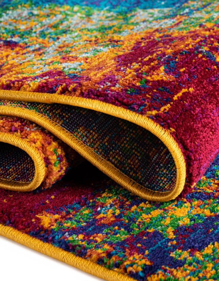 This piece works well as a focal layer in a modern living room or beneath a round dining table to introduce color and energy. It pairs easily with clean-lined, mid-century or contemporary furnishings and also complements eclectic, bohemian interiors where mixed patterns and vibrant hues are welcome. The lively palette can brighten a neutral scheme or tie together rooms that already use jewel tones and natural wood finishes.