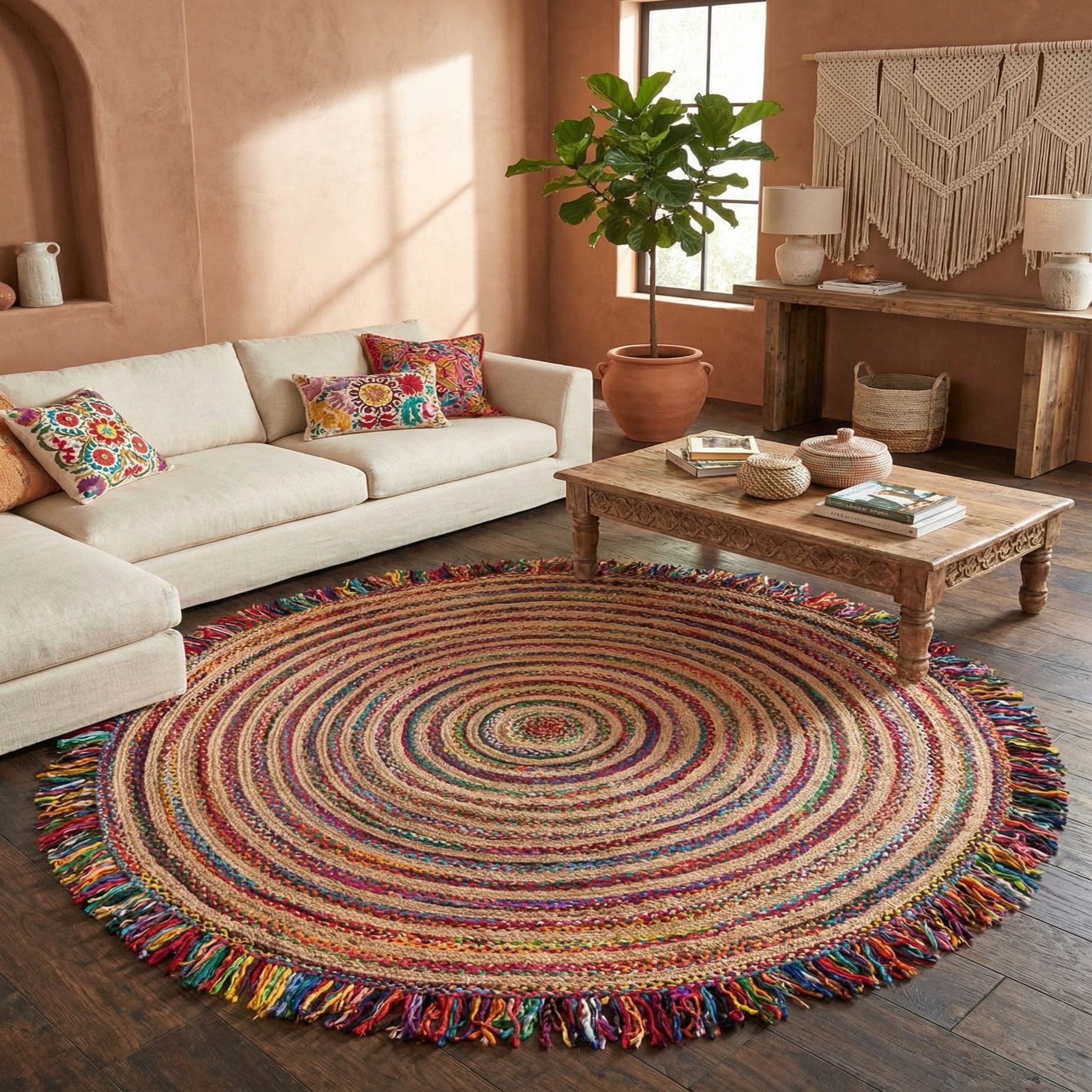 A 10-foot round Chindi Jute rug featuring a spiral of natural jute and colorful braided fabric, with a fringed edge.