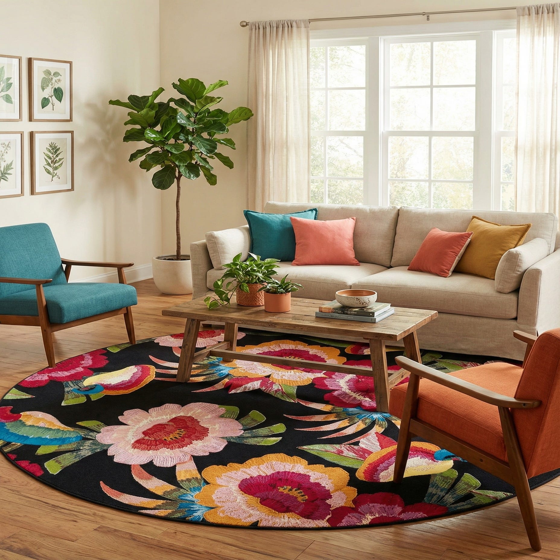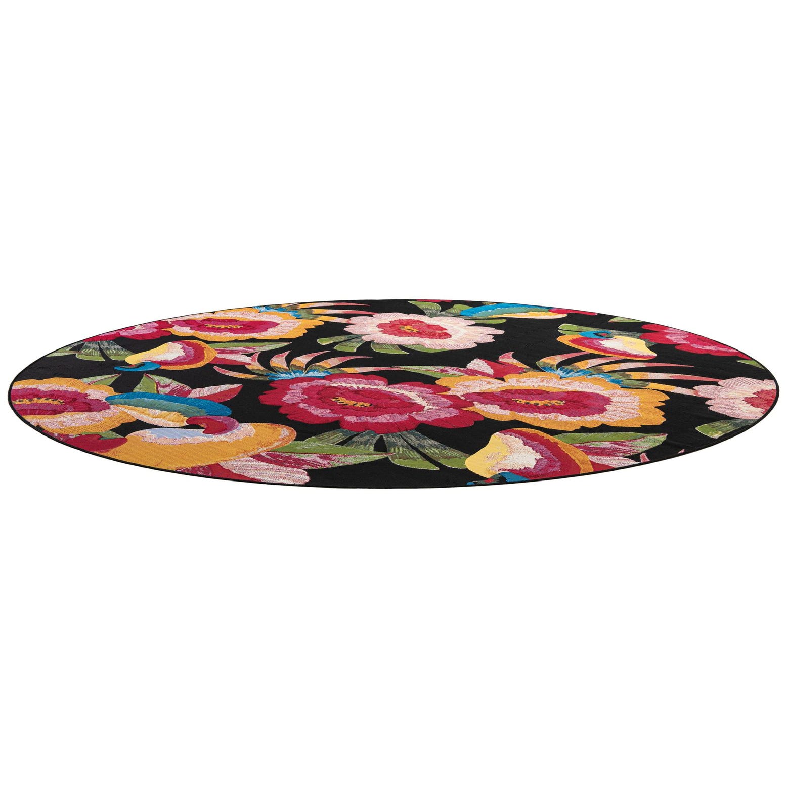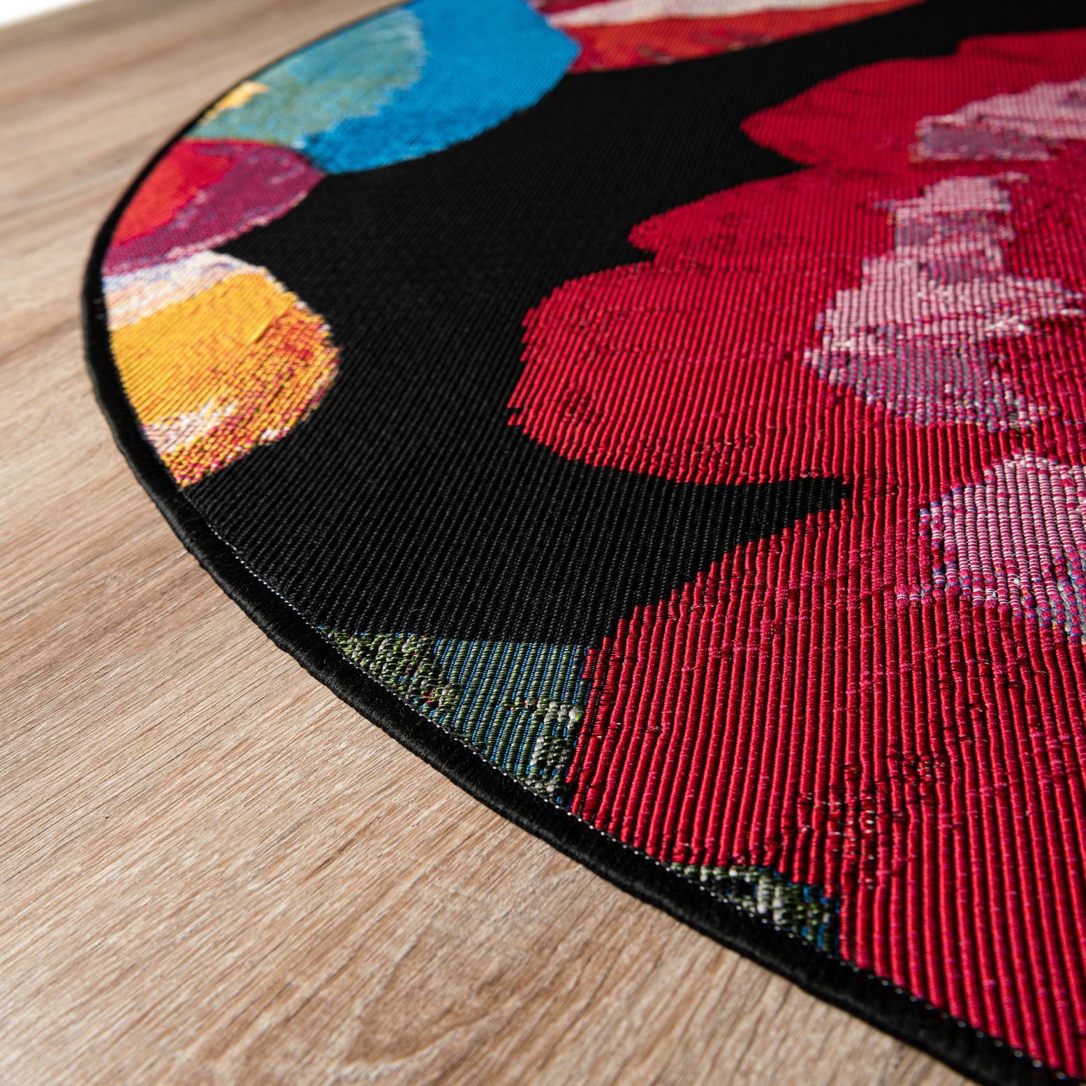 A round, multi-colored modern botanical rug with large red, pink, and orange flowers and green leaves on a black background.