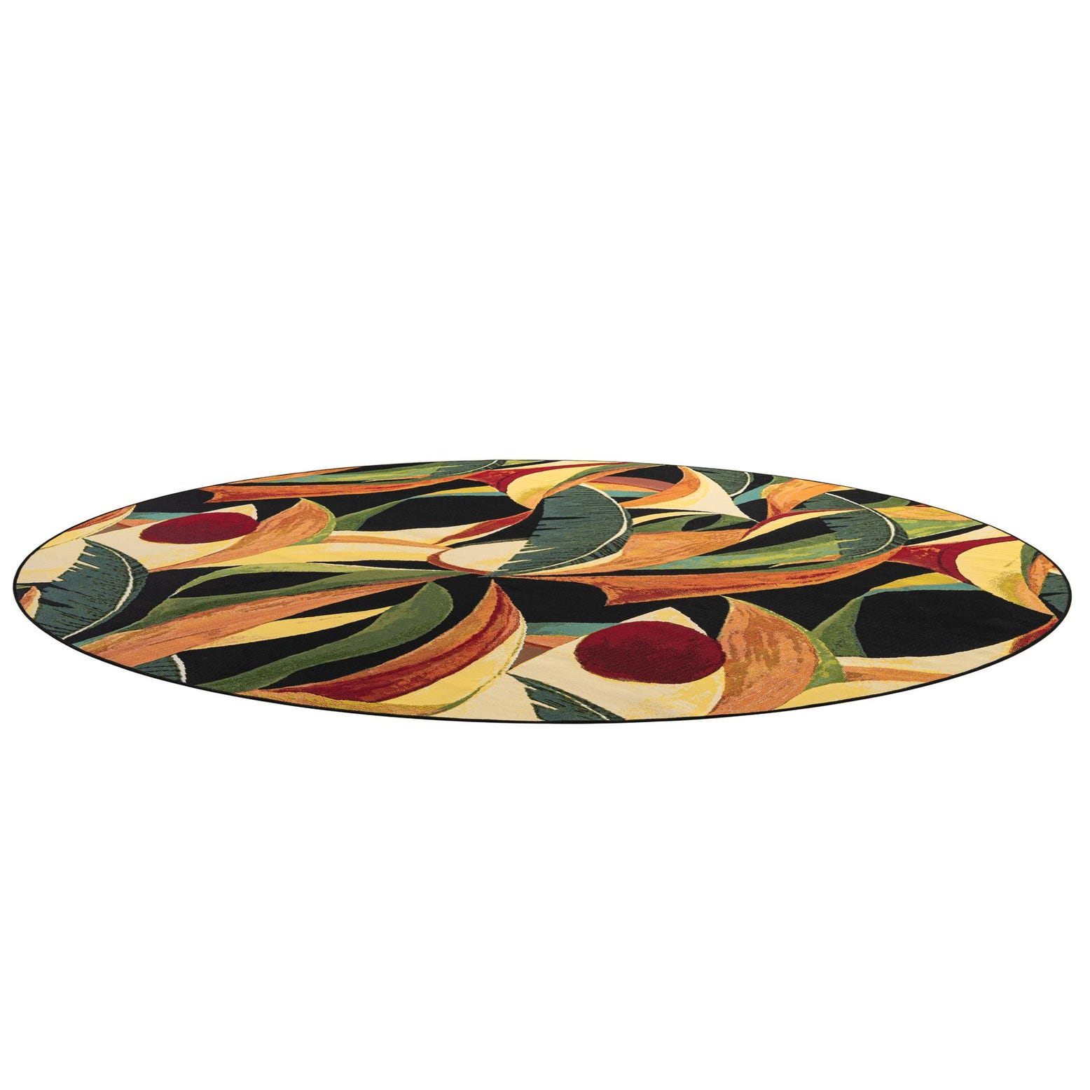 A sweeping botanical motif fills the round shape with overlapping, curved leaf forms and painterly arcs. The background is multi, with pockets of deep black that sharpen the composition and let the warm palette — olive, gold, tan, orange, brown, yellow, and touches of blue plus a rich red accent — read clearly across the surface. Machine made of 75% polypropylene and 25% polyester, the rug has a low-pile, tightly woven texture that feels smooth and slightly resilient underfoot, giving the pattern crisp definition and a tailored look.