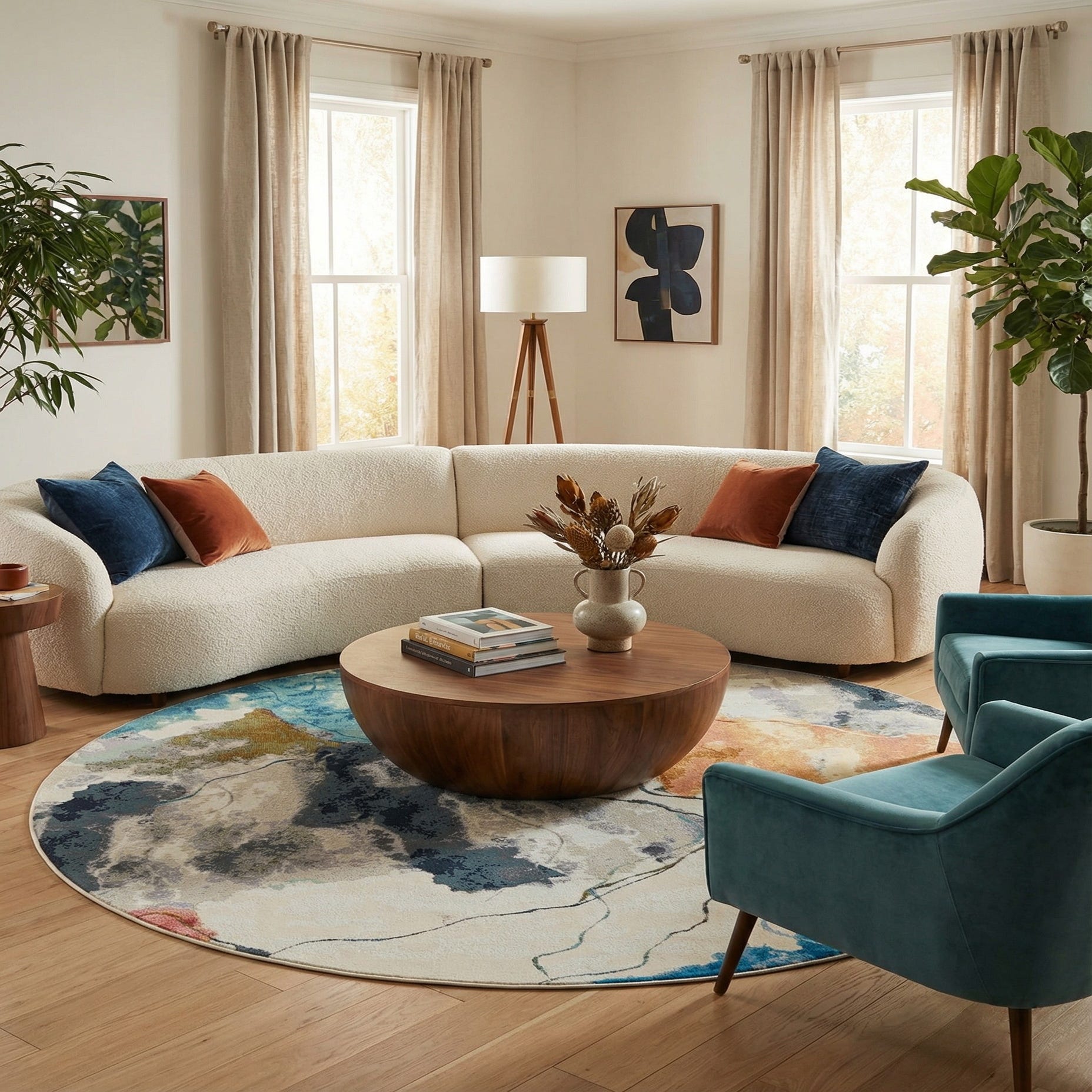 A 10' round multi-colored abstract rug with splashes of orange, blue, pink, and gray on a light background, suitable for a patio.