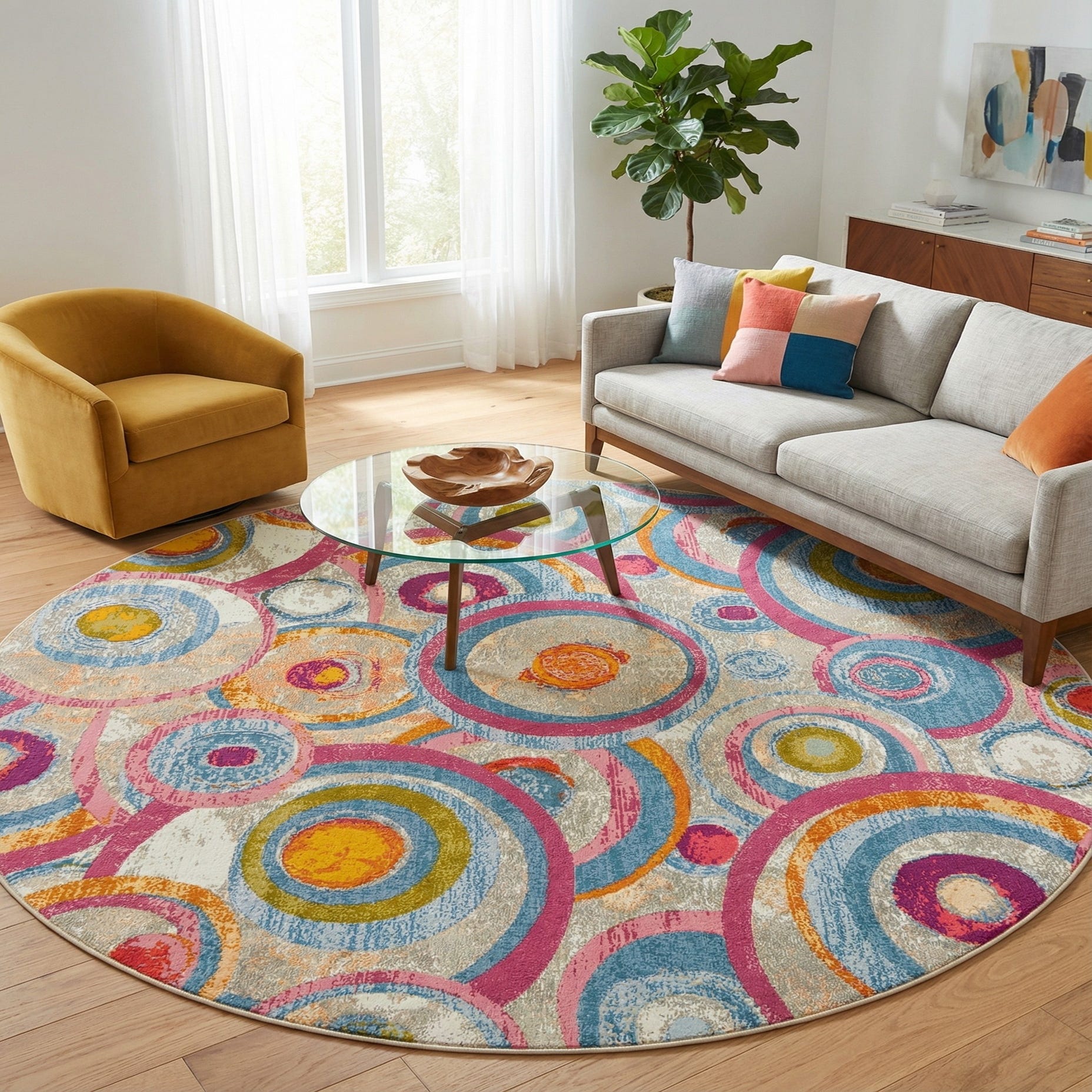 This rug works well on a covered patio or sunroom, where its color mix complements natural woods and woven furniture, and it also anchors casual living or dining areas indoors. Pair it with mid-century modern seating and bold accent pillows for a graphic, contemporary look, or combine it with light linens and rattan pieces for a relaxed, coastal-modern setting. The round shape is ideal for circular seating arrangements or placing beneath a small dining set to define the space.