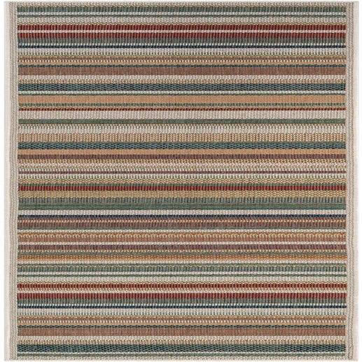 A 10 ft runner rug with a modern stripe pattern in multi-colored hues, suitable for a hallway or patio.