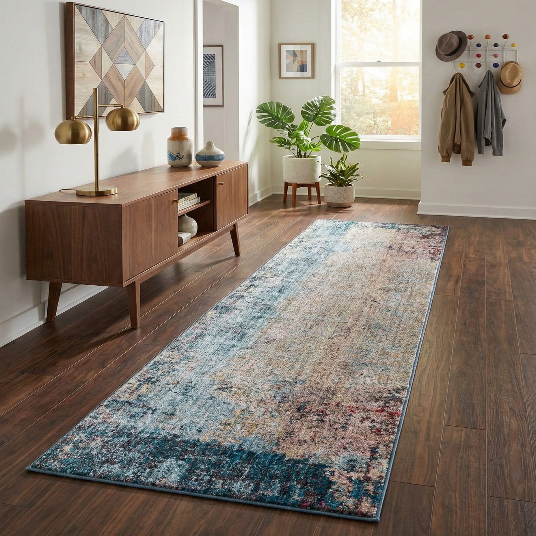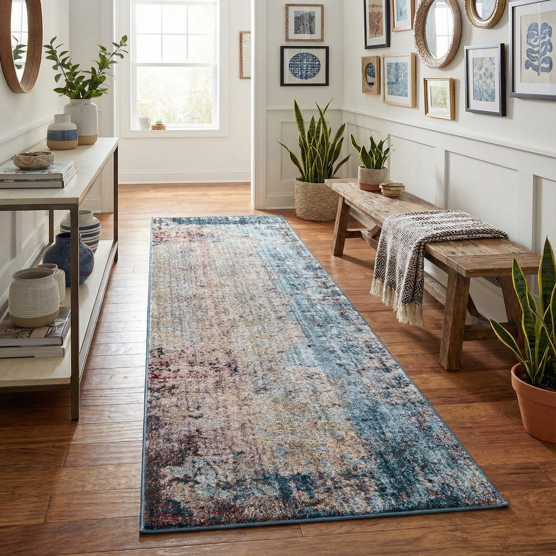 This runner works well in narrow spaces where color and texture can make an impact: place it in an entryway or hallway to introduce color without overwhelming the space, alongside a bed to add softness and visual interest, or in a kitchen corridor where the layered color palette pairs nicely with warm woods and matte metal finishes. The contemporary, slightly distressed aesthetic complements modern, transitional, and eclectic interiors—pair it with leather seating, linen textiles, or mid-century furnishings to balance warmth and modern edge.
