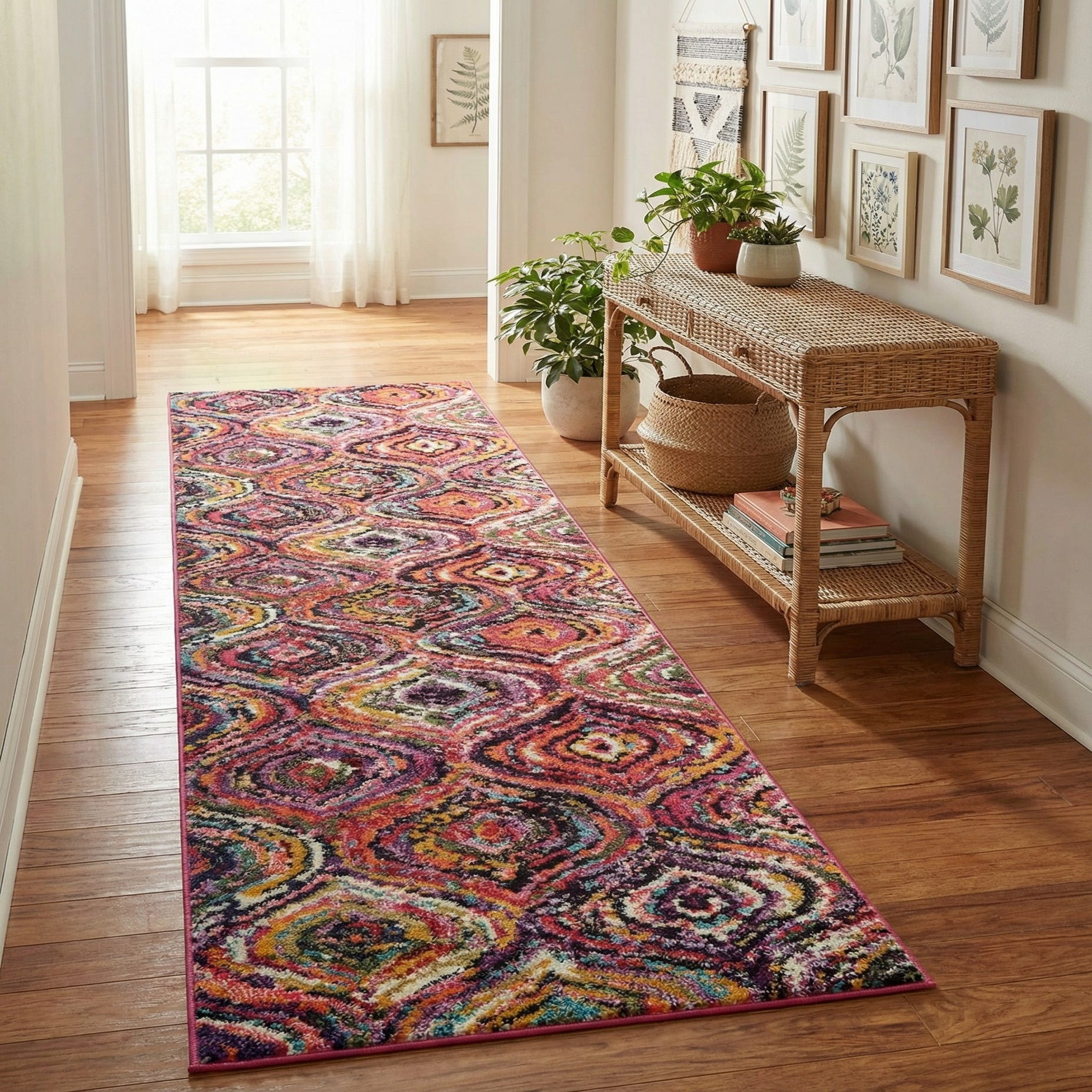 Machine-made from 100% polypropylene, the pile has a plush, slightly shaggy hand that feels soft underfoot while holding the color contrasts with clarity. This runner works well in narrow spaces where color and pattern can make a strong statement: use it to enliven a hallway or stair landing, guide traffic through a kitchen aisle, or add personality along a bedroom corridor. Pair it with warm wood flooring and neutral upholstery to let the rug be the focal point, or layer it with solid rugs and pillows in navy, ivory, or gold for a coordinated, collected look.