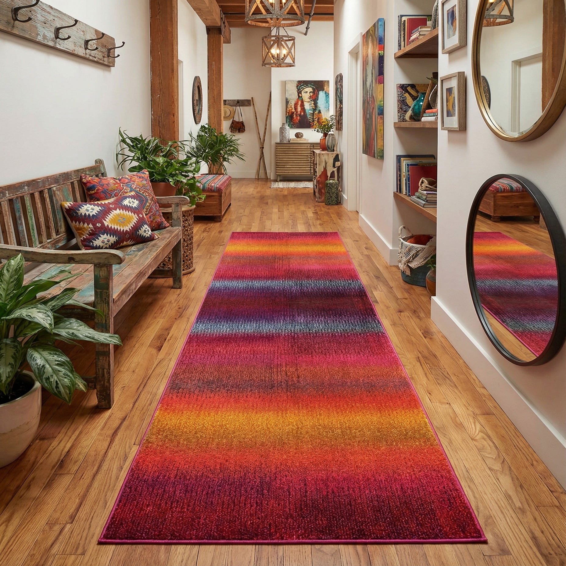This runner works best in high-traffic hallways and entryways where color can anchor a narrow space, or alongside a kitchen island to add warmth and energy underfoot. It pairs well with contemporary and eclectic interiors — think clean-lined sofas and neutral walls that welcome a bold accent, or layered over hardwood floors in a bohemian-inspired hallway with natural wood and brass accents. The saturated tones also bring a lively contrast to minimalist spaces and can complement mid-century modern furnishings when you want a vivid, artful focal point.