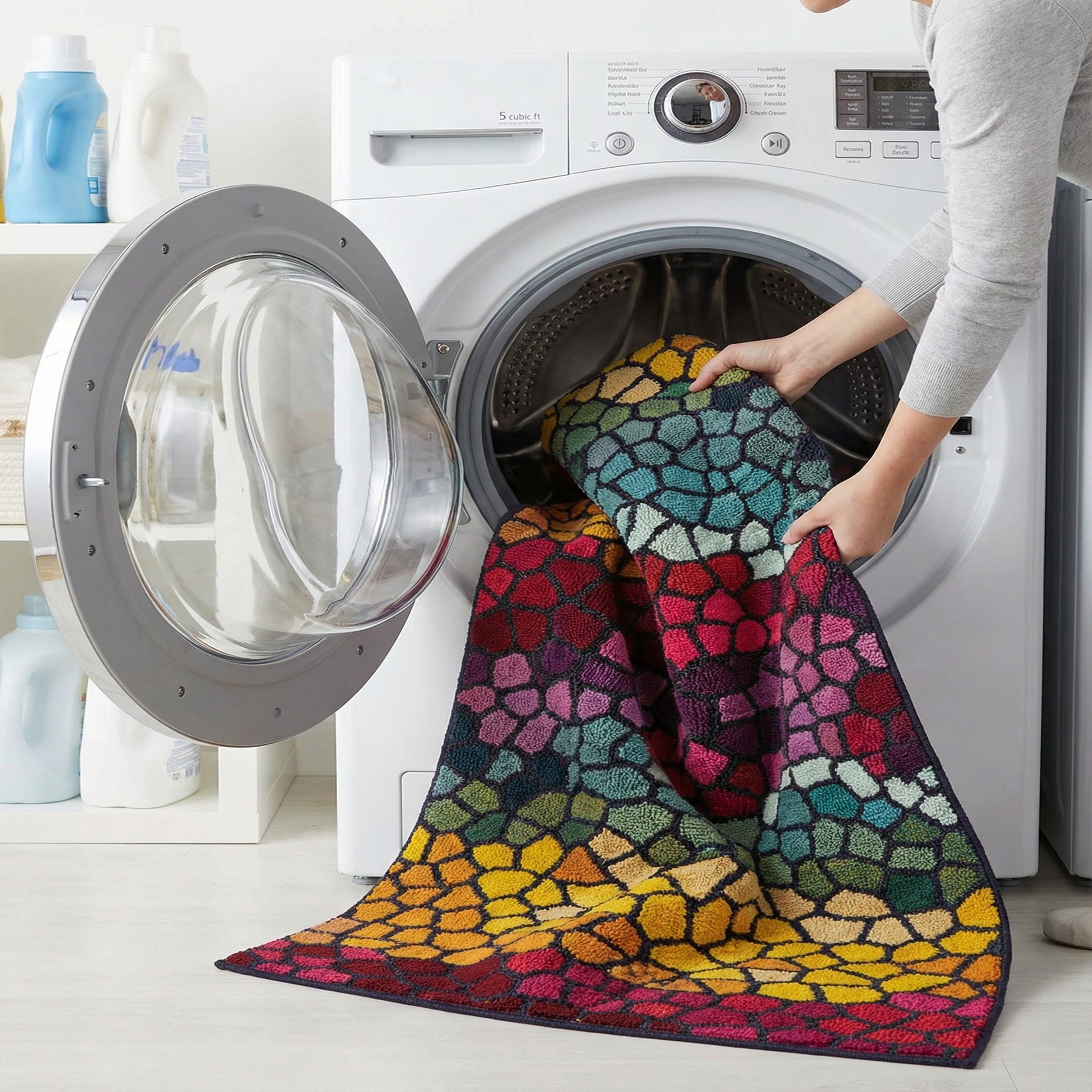 A vibrant multi-colored runner rug with a modern abstract mosaic pattern, ideal for a hallway.